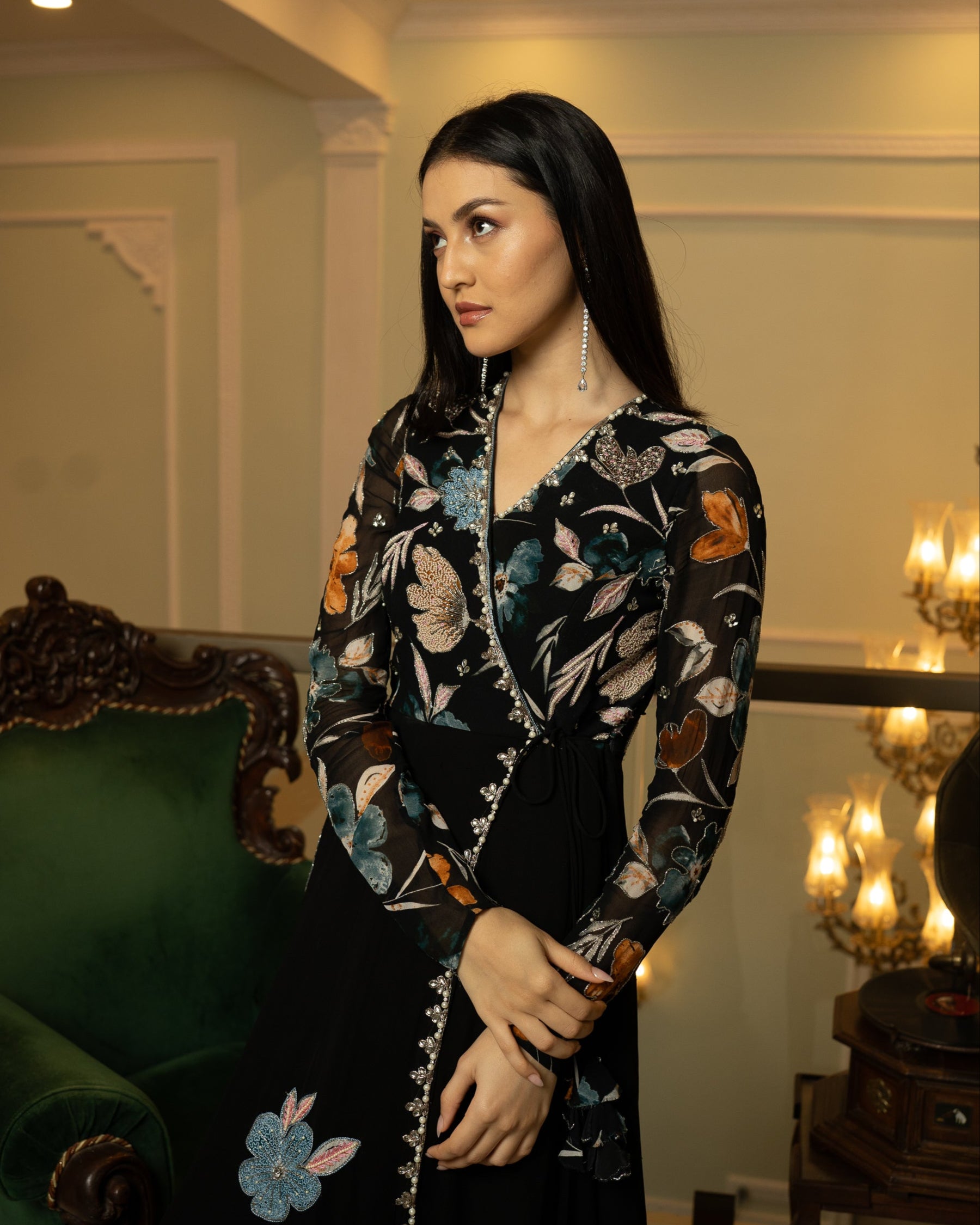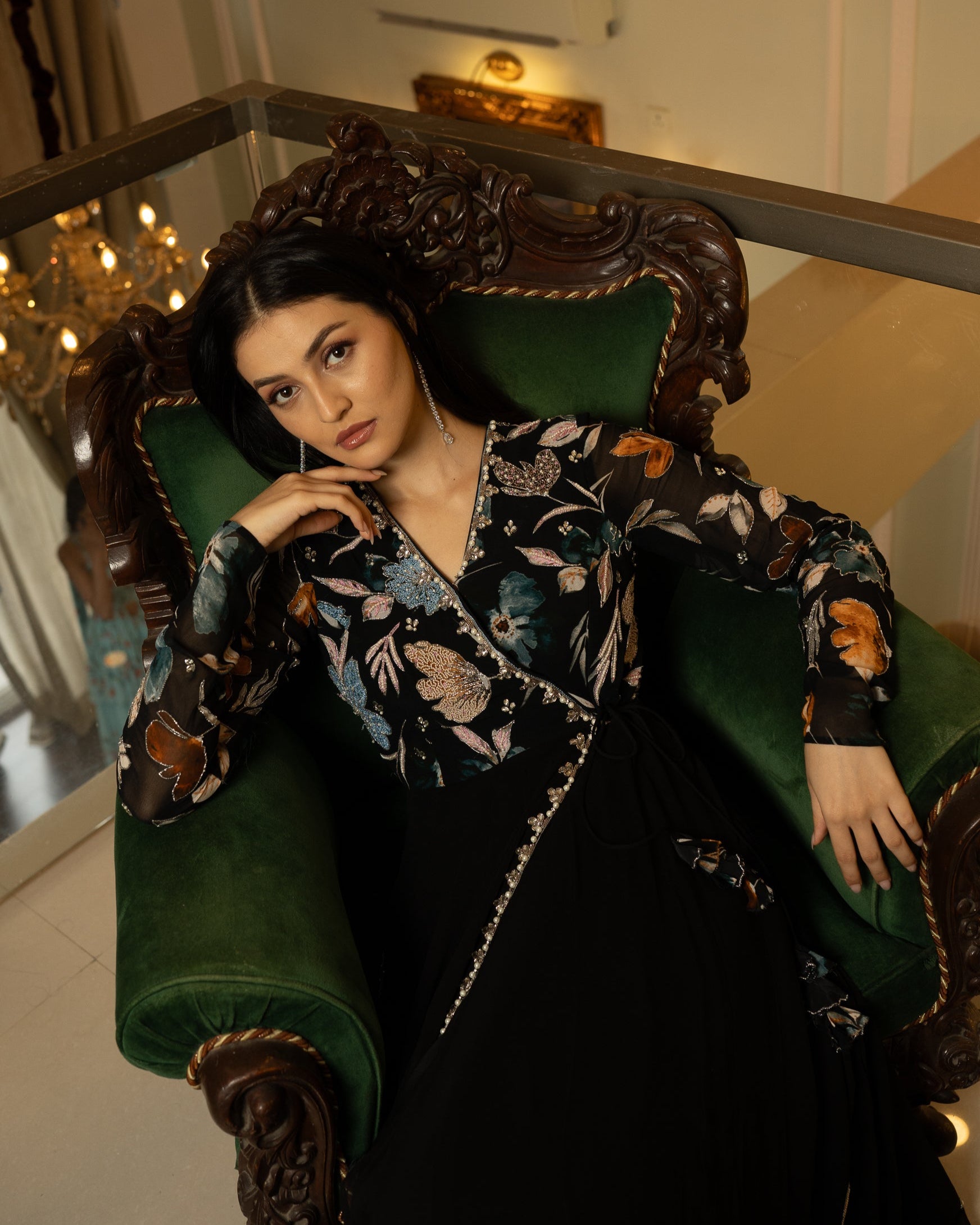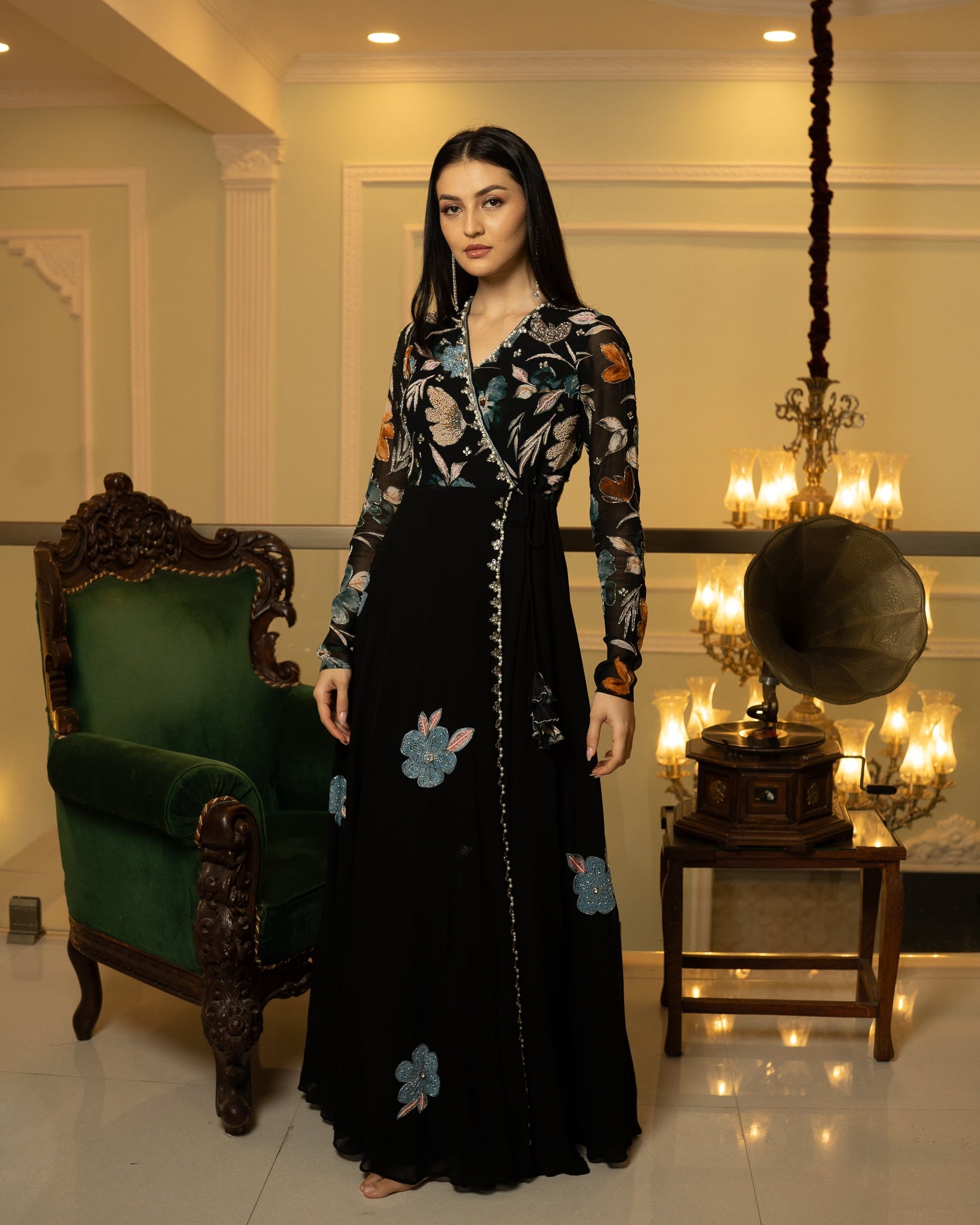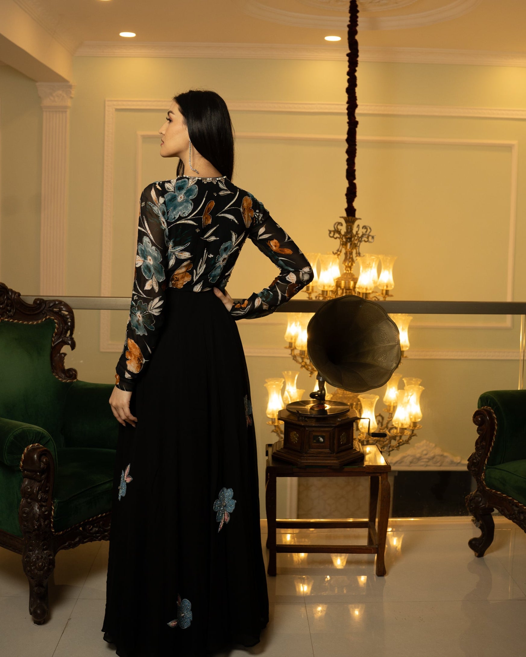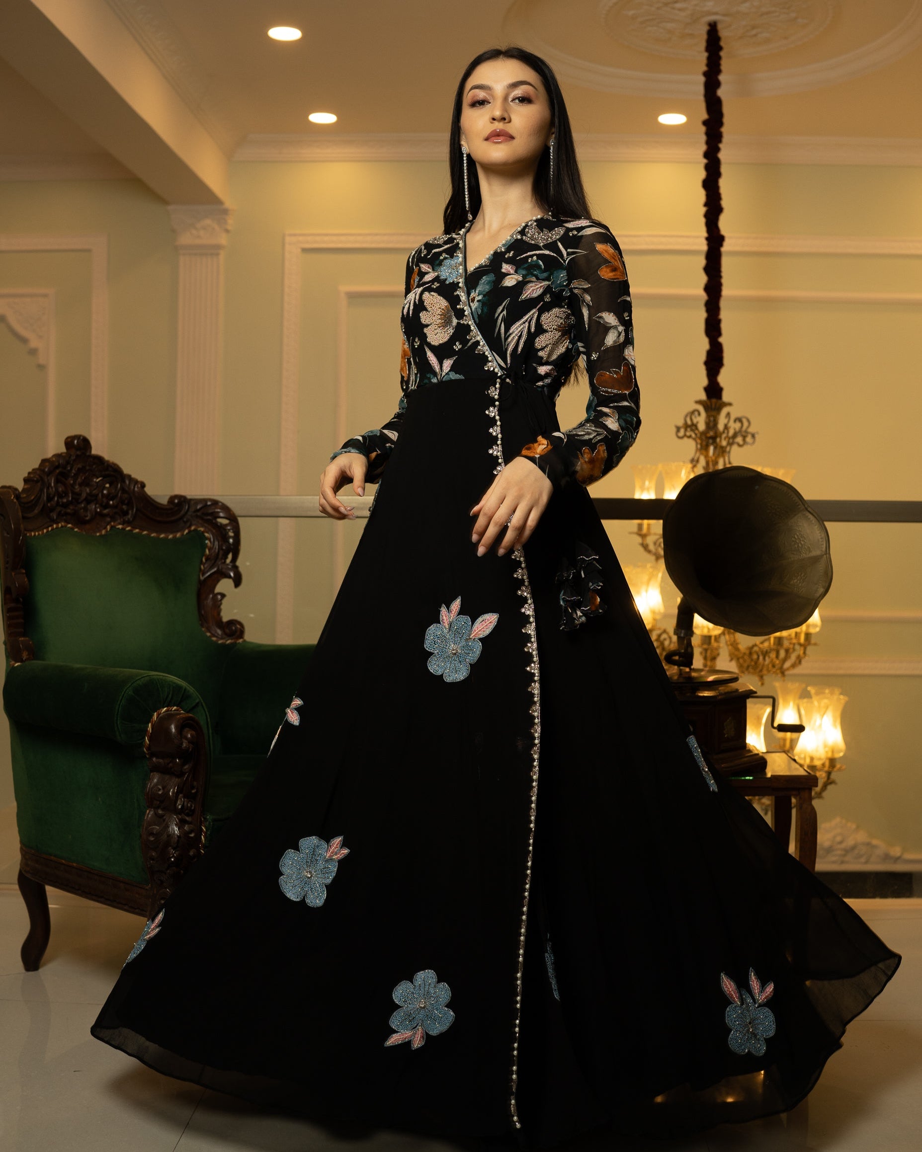 A show-stopping black georgette gown, heavily embellished for a perfect blend of elegance and sparkle. Ideal for making a memorable statement at any special occasion.