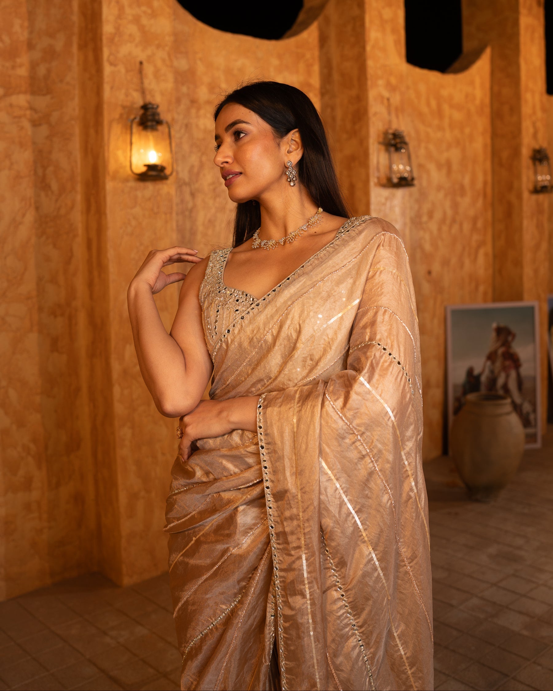 This exquisite rose gold saree features intricate mirror work on the blouse,