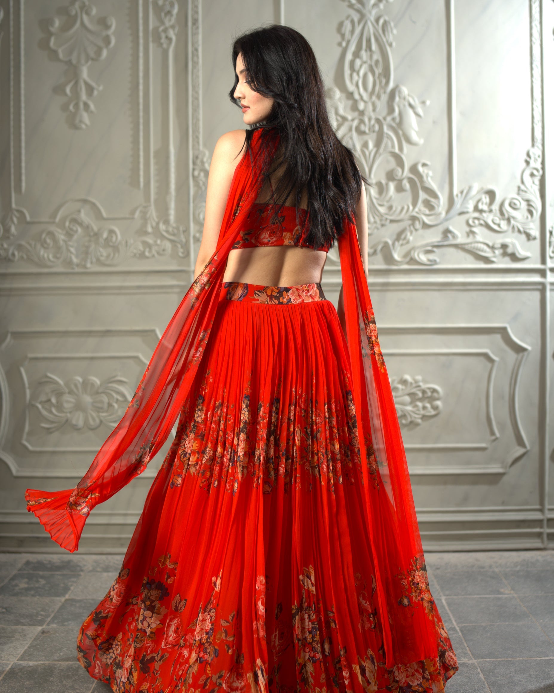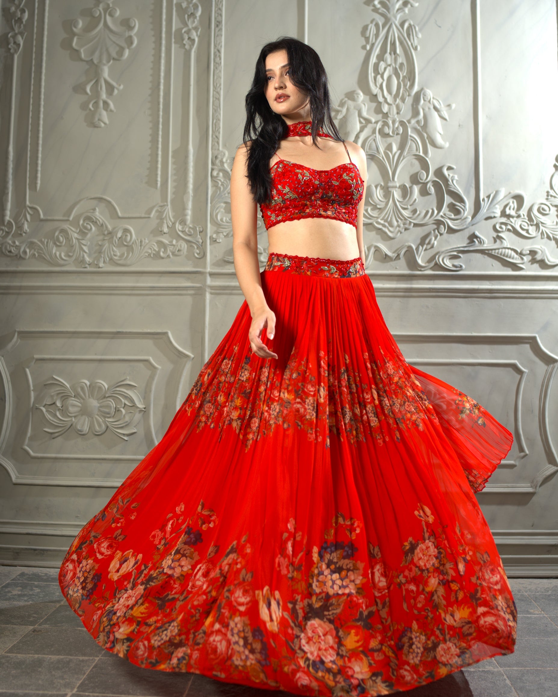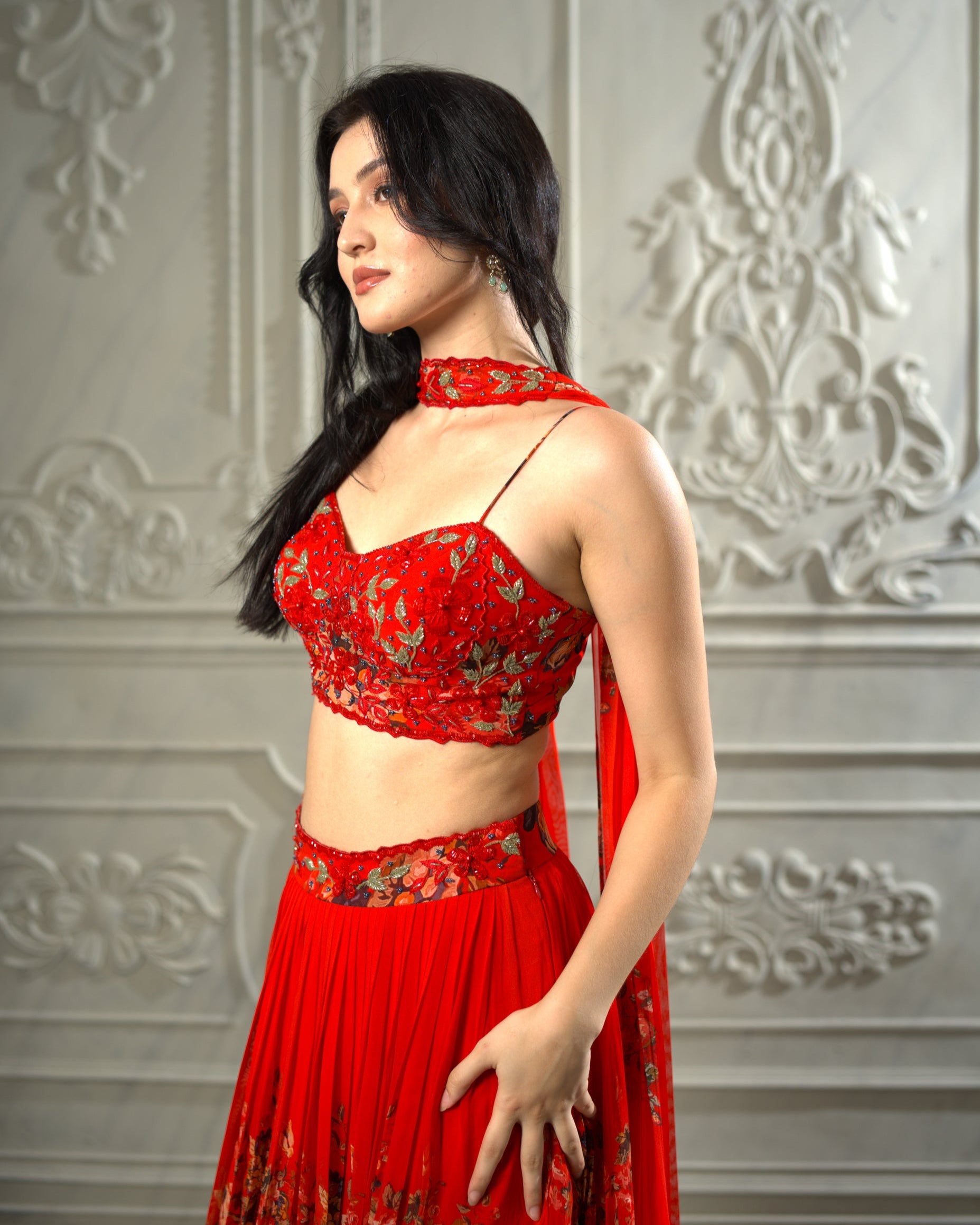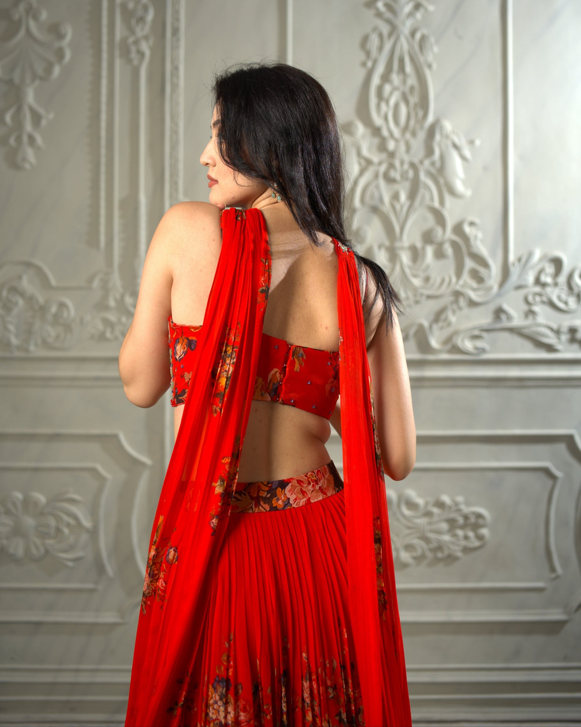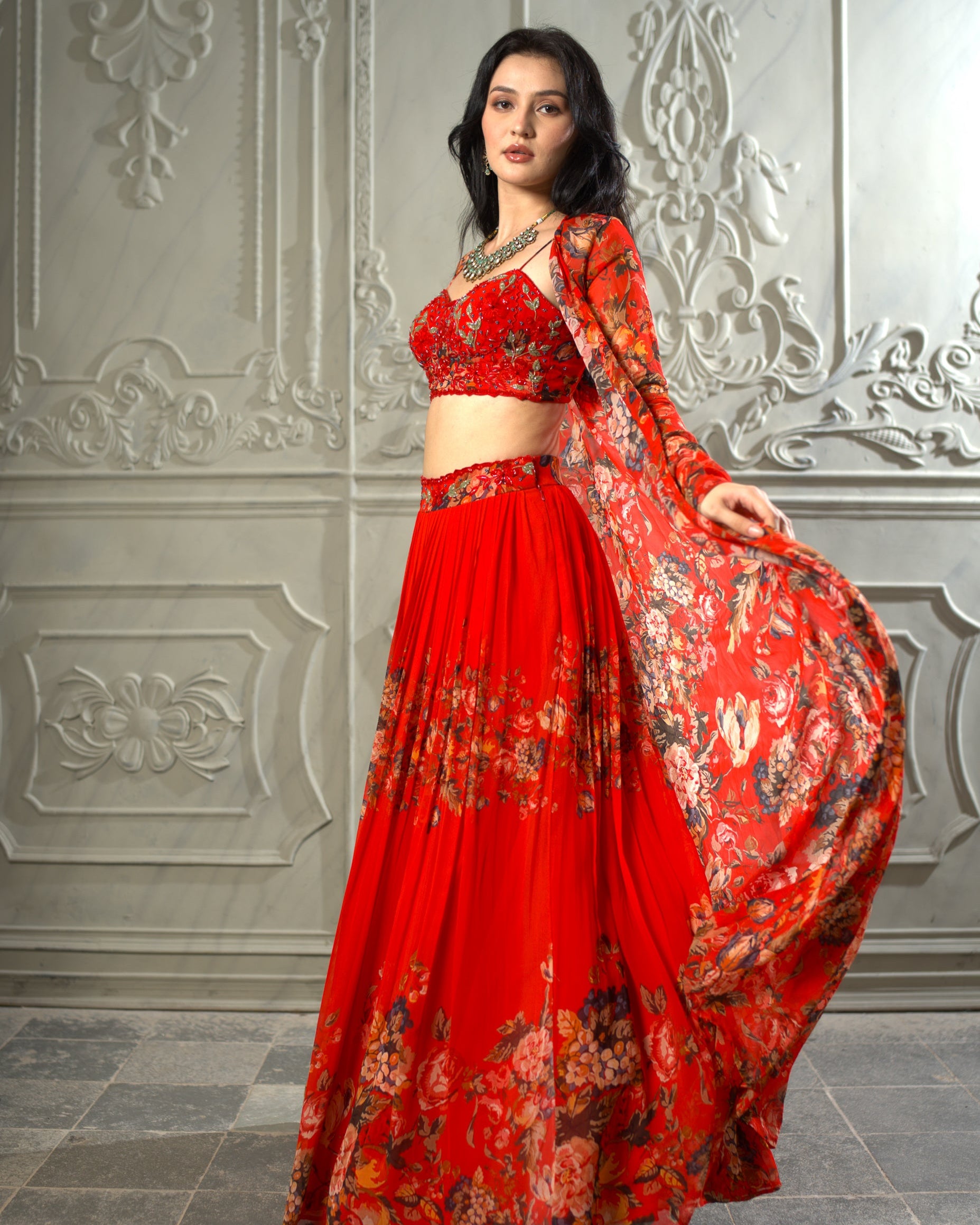 Deep Venetian red embroidered corset with a printed georgette cape.