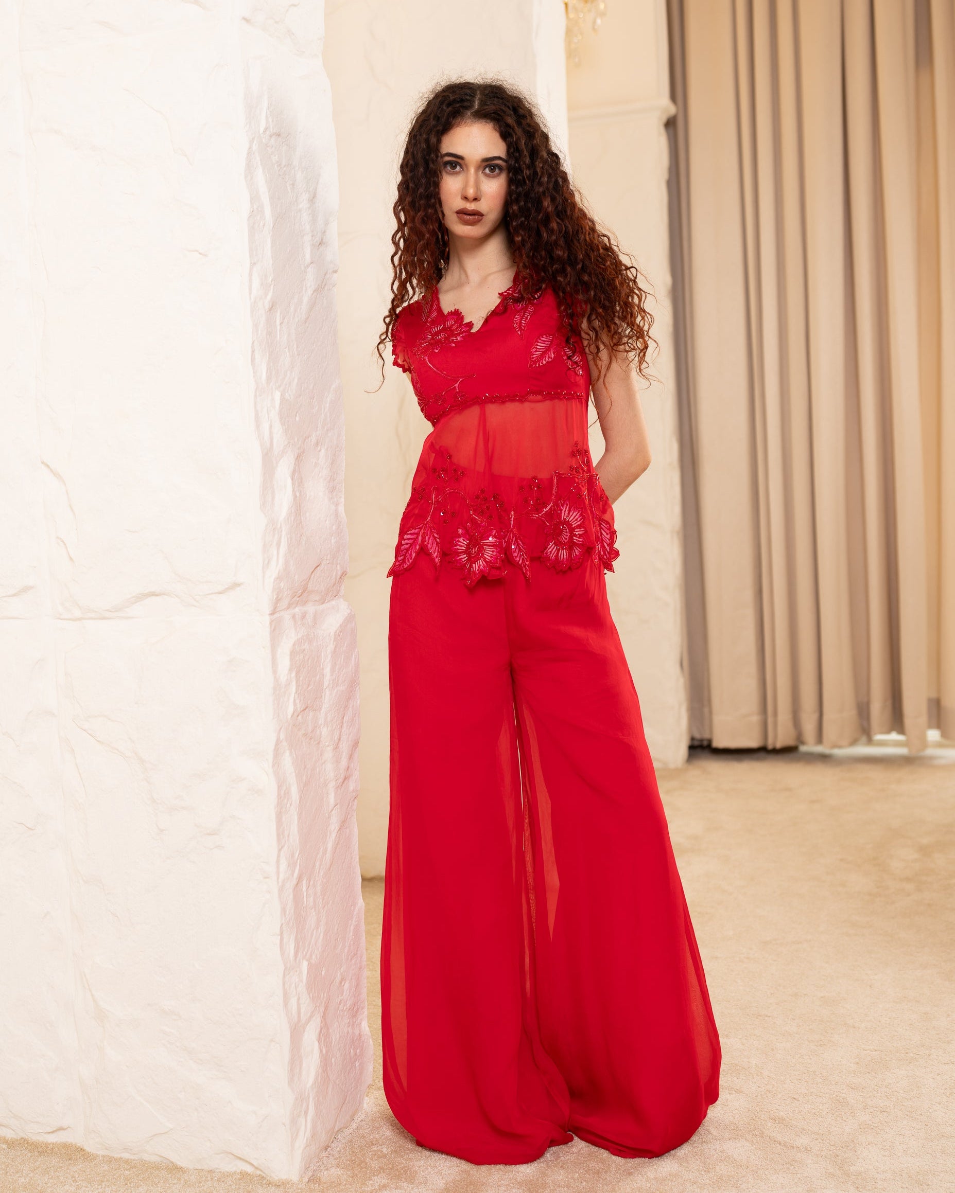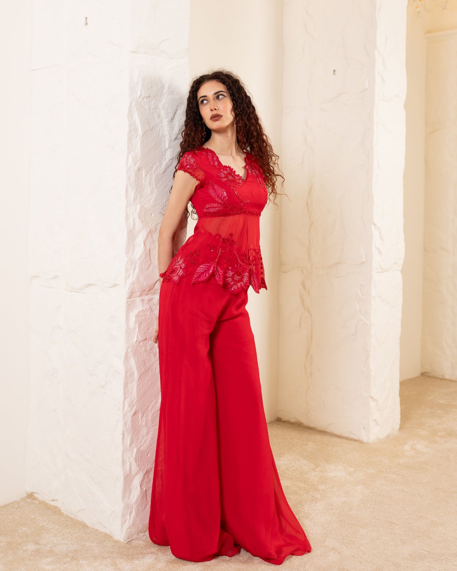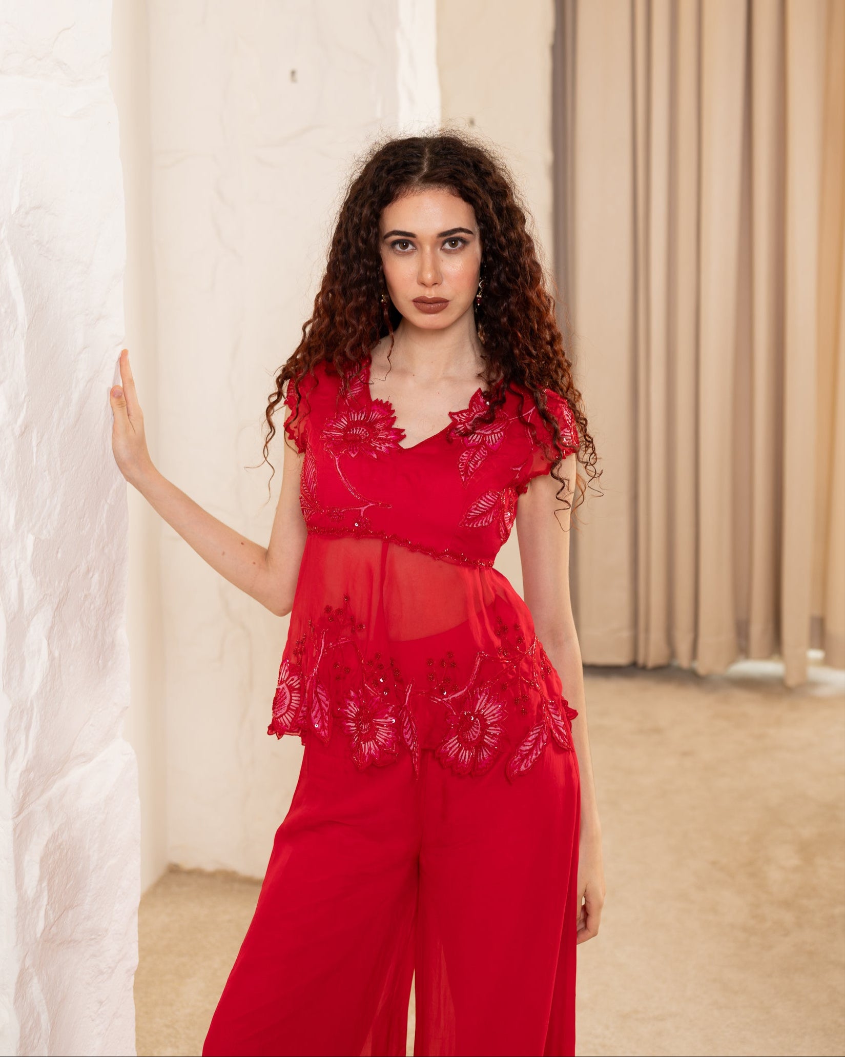 She’s a hand embroidered peplum top with floral hand embroidery.