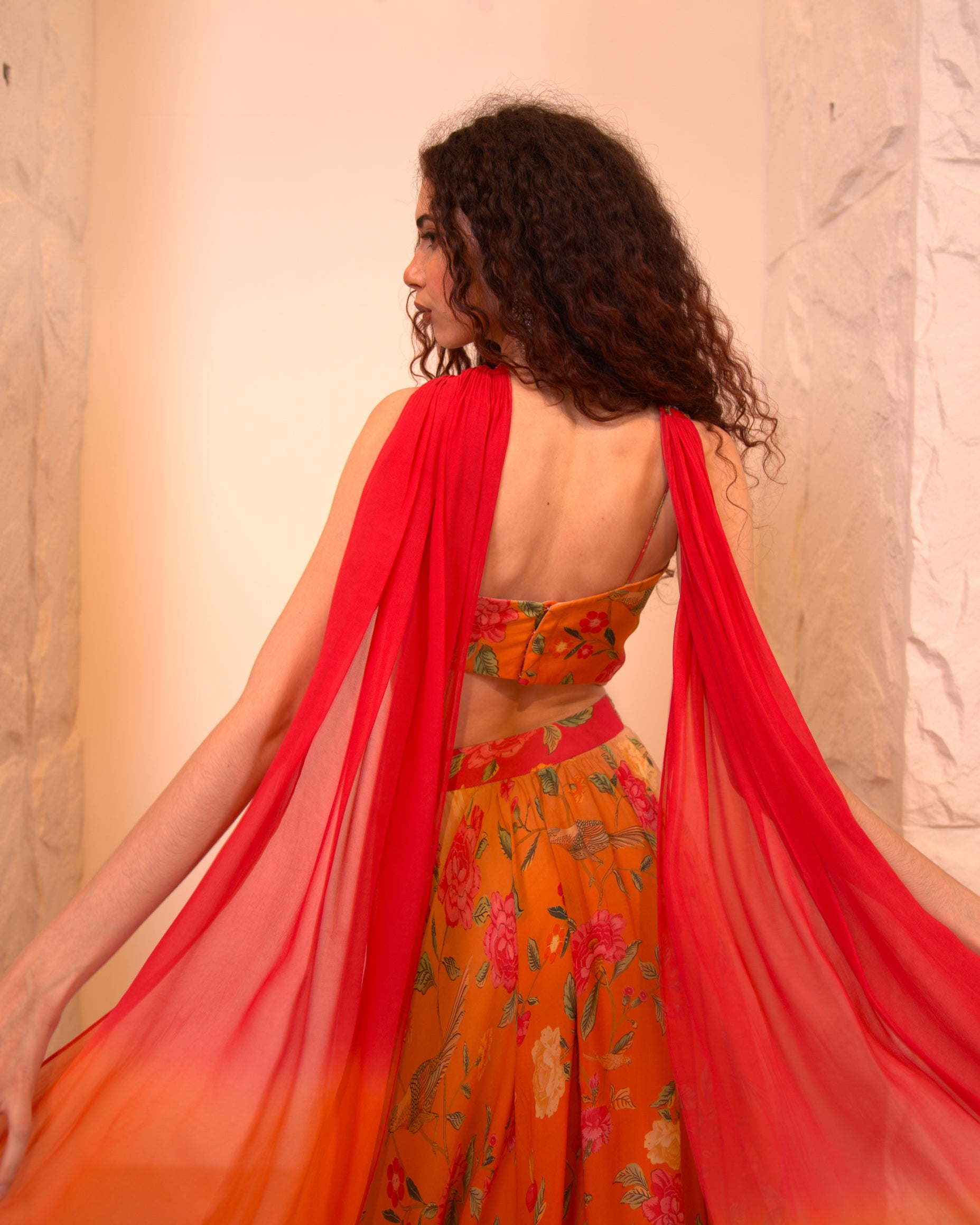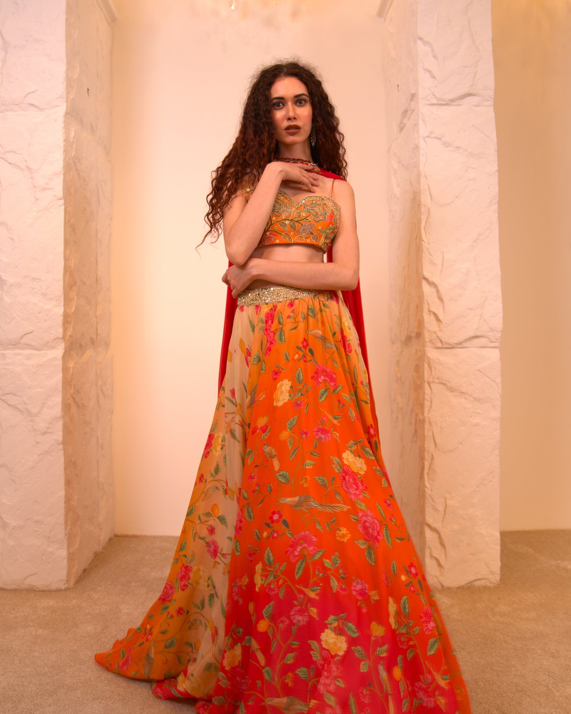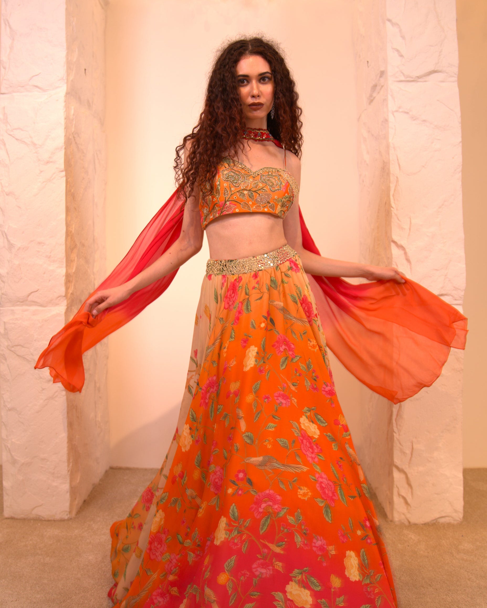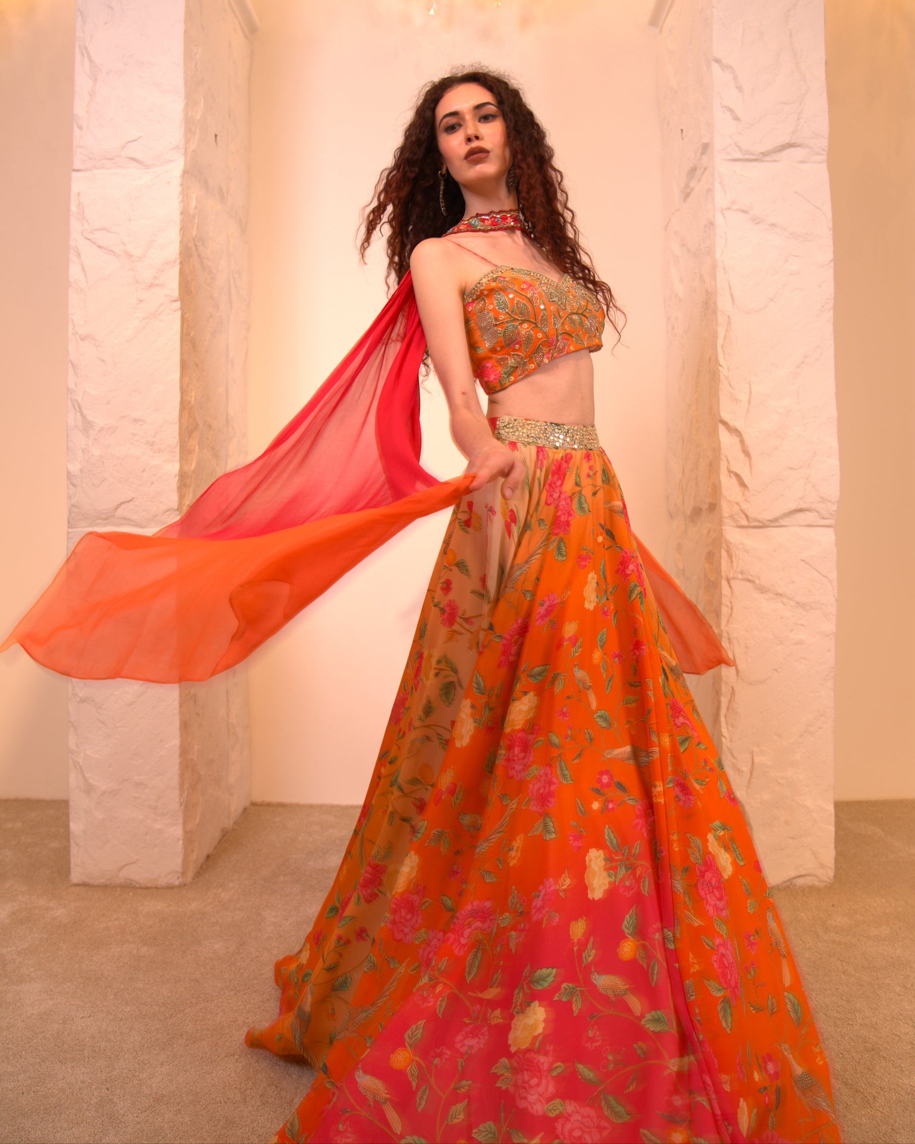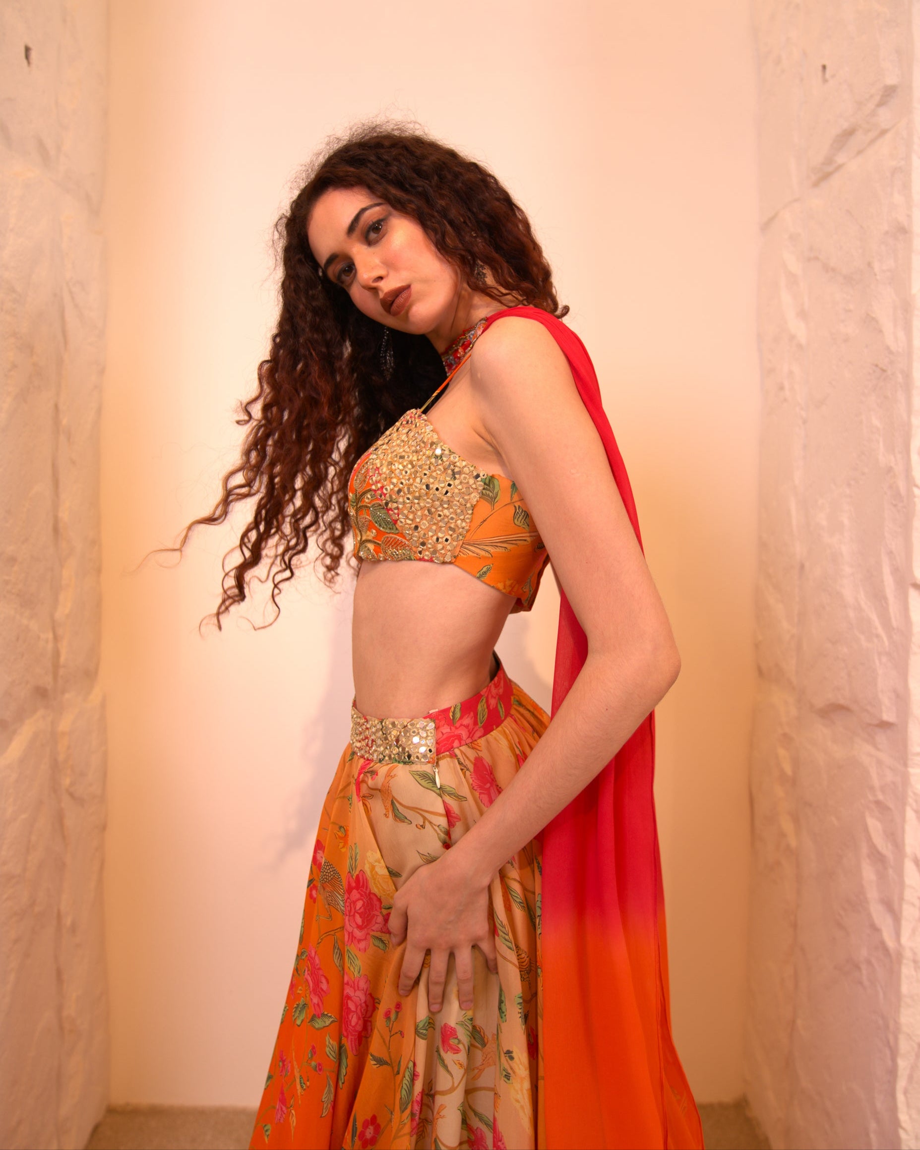 She’s a lehenga that captures the entire sunshine cycle from sunrise to sunset in its vibrant hues. The blouse mirrors the dazzle of daylight with intricate mirror work, while a chic choker dupatta adds a touch of elegance. It’s like wearing a day's worth of sunshine.