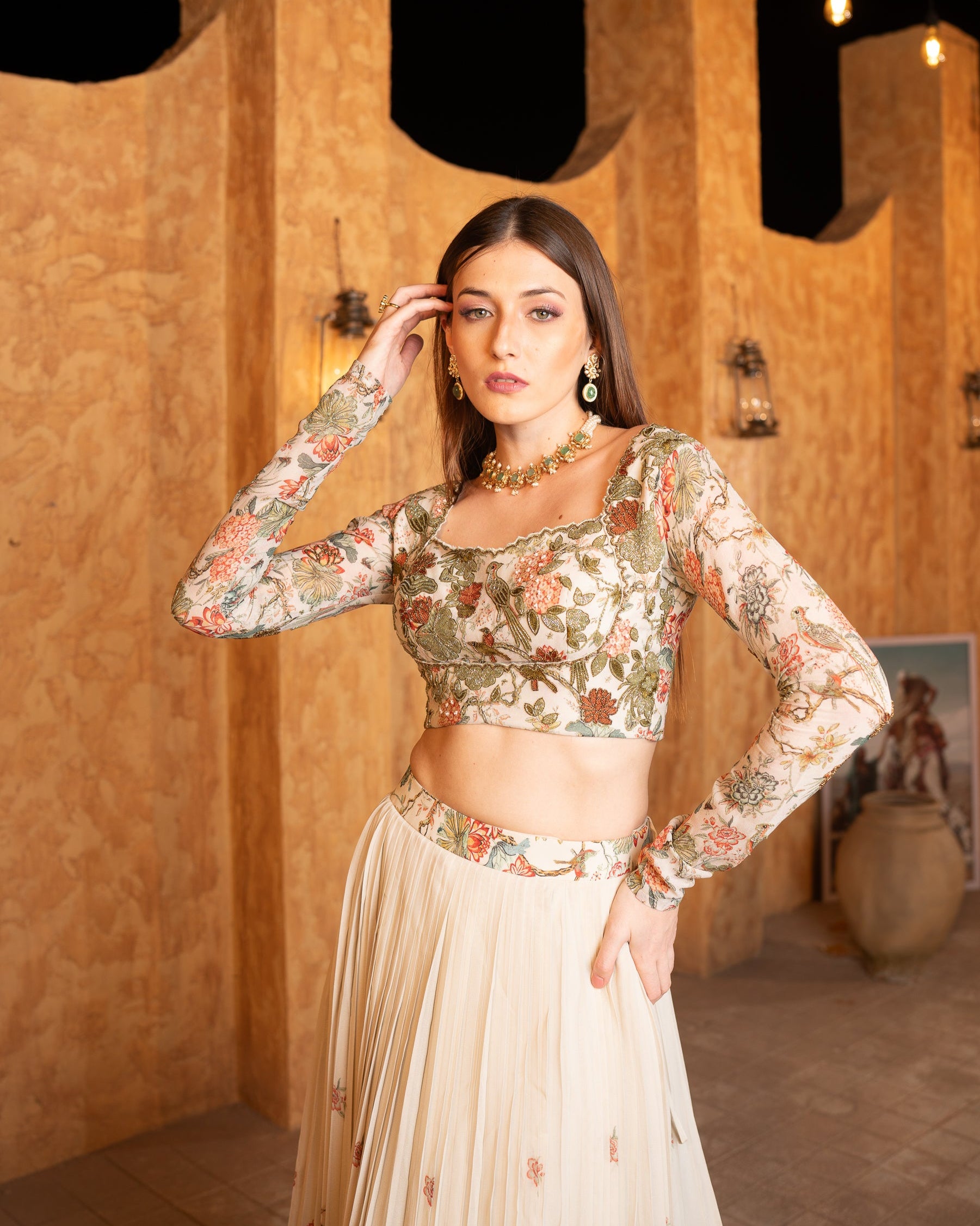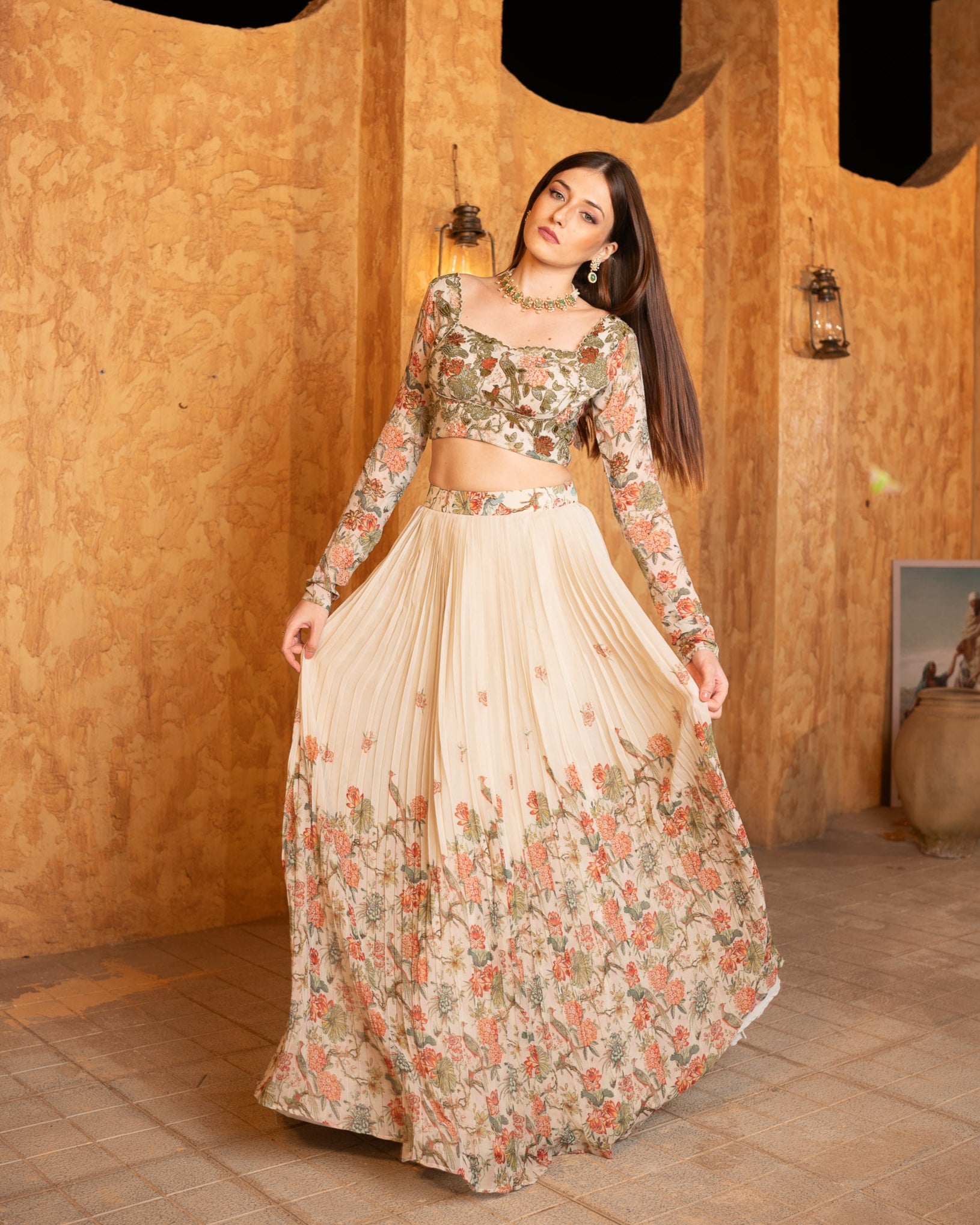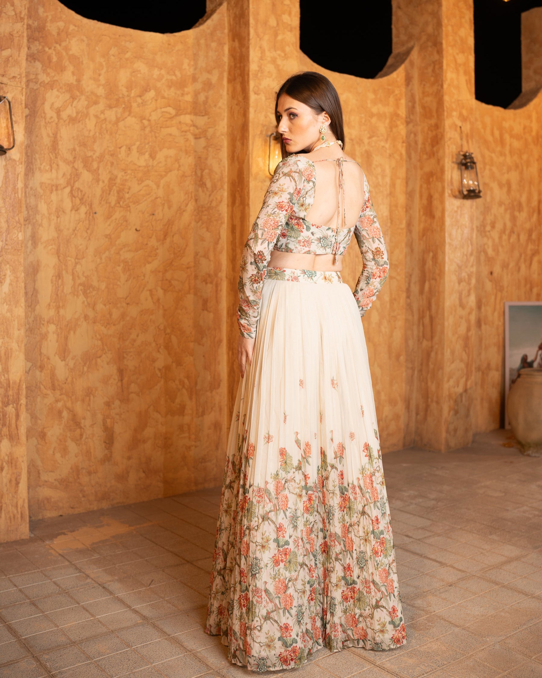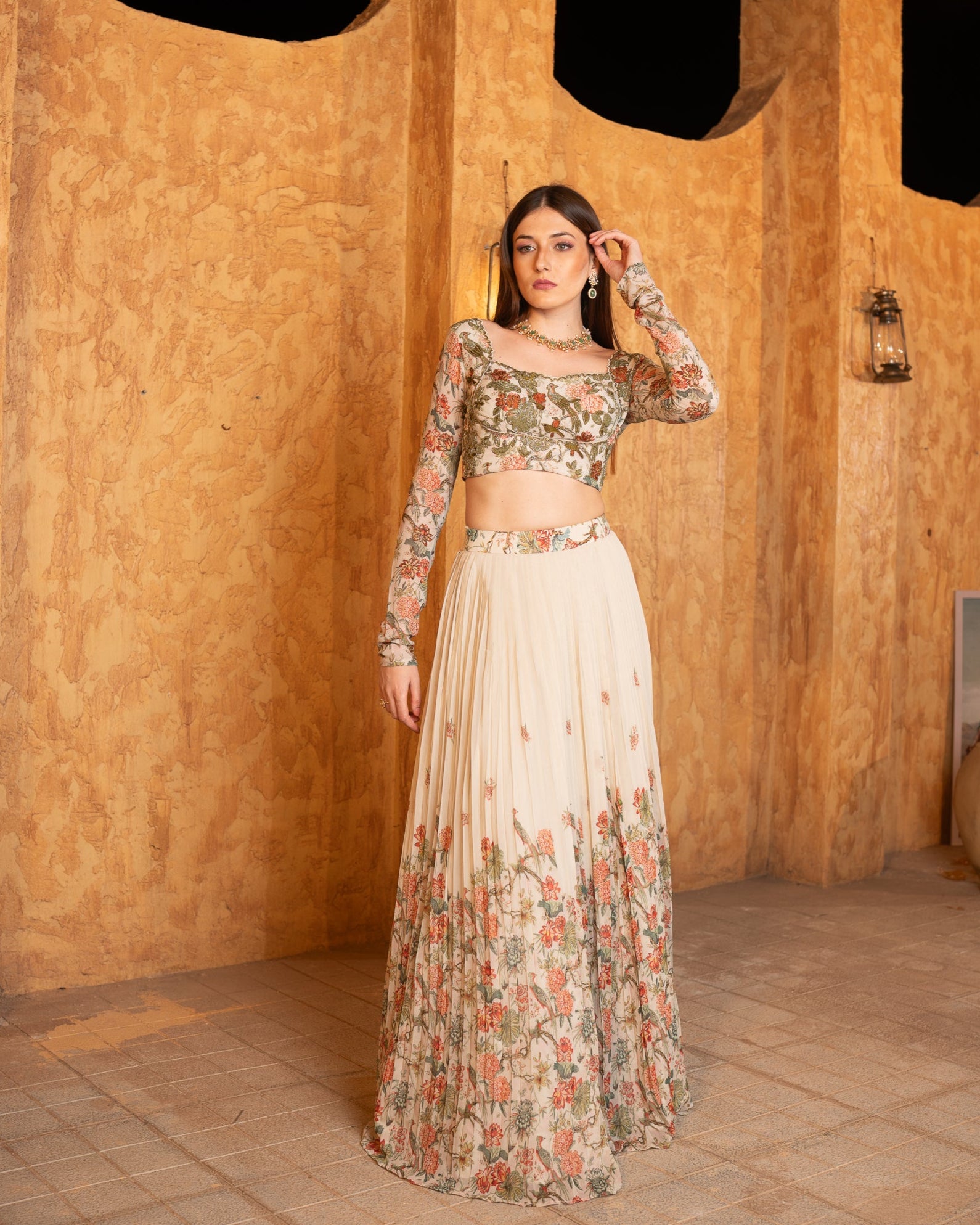 This piece is a pure georgette lehenga with delicate handwork and floral prints. The flowy skirt features pastel-toned motifs, exuding elegance and grace, while the fitted full-sleeve blouse adds a modern yet traditional touch. Perfect for weddings or formal events, it blends timeless charm with contemporary style.