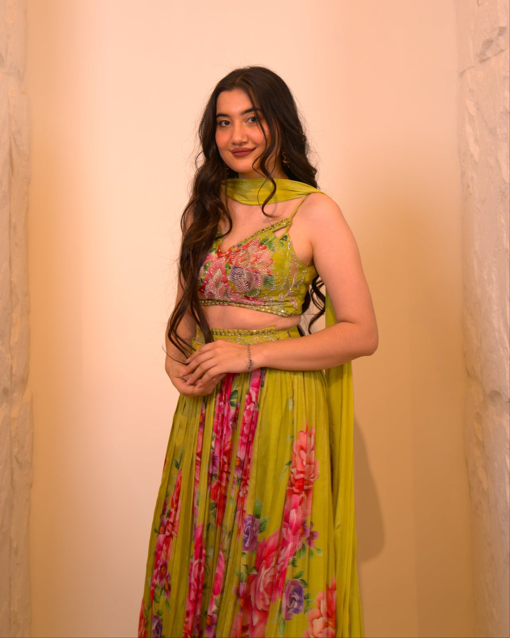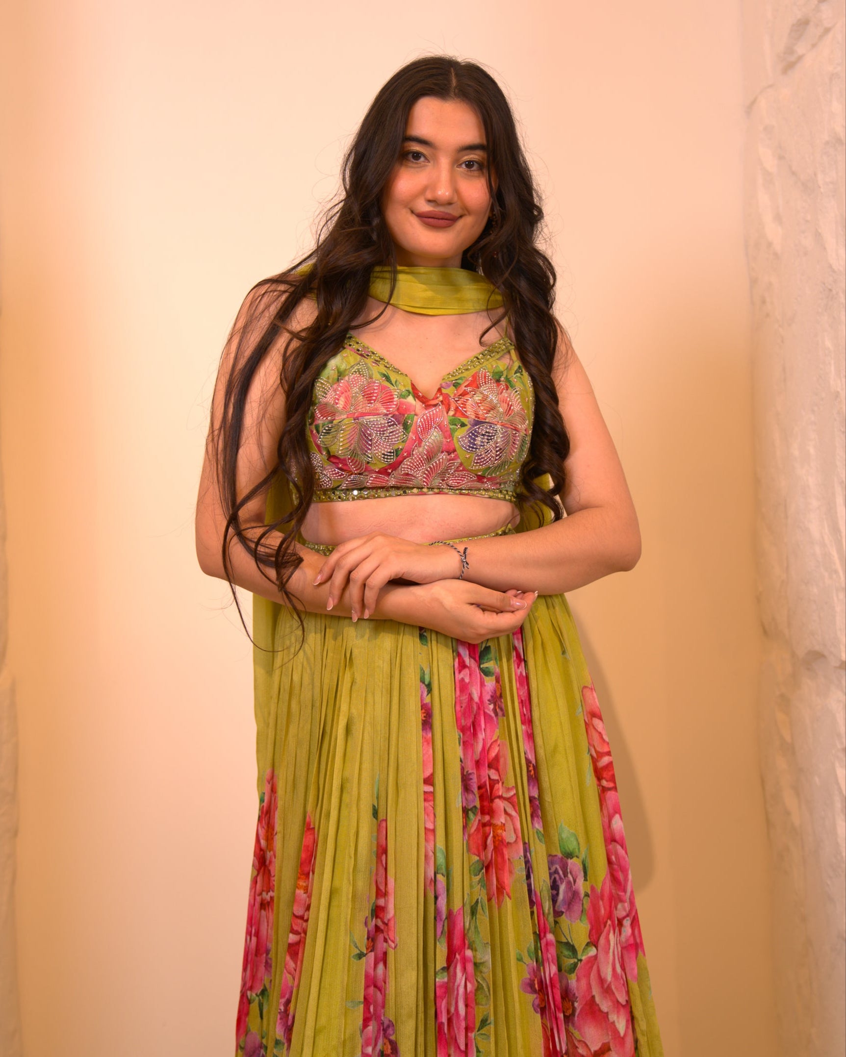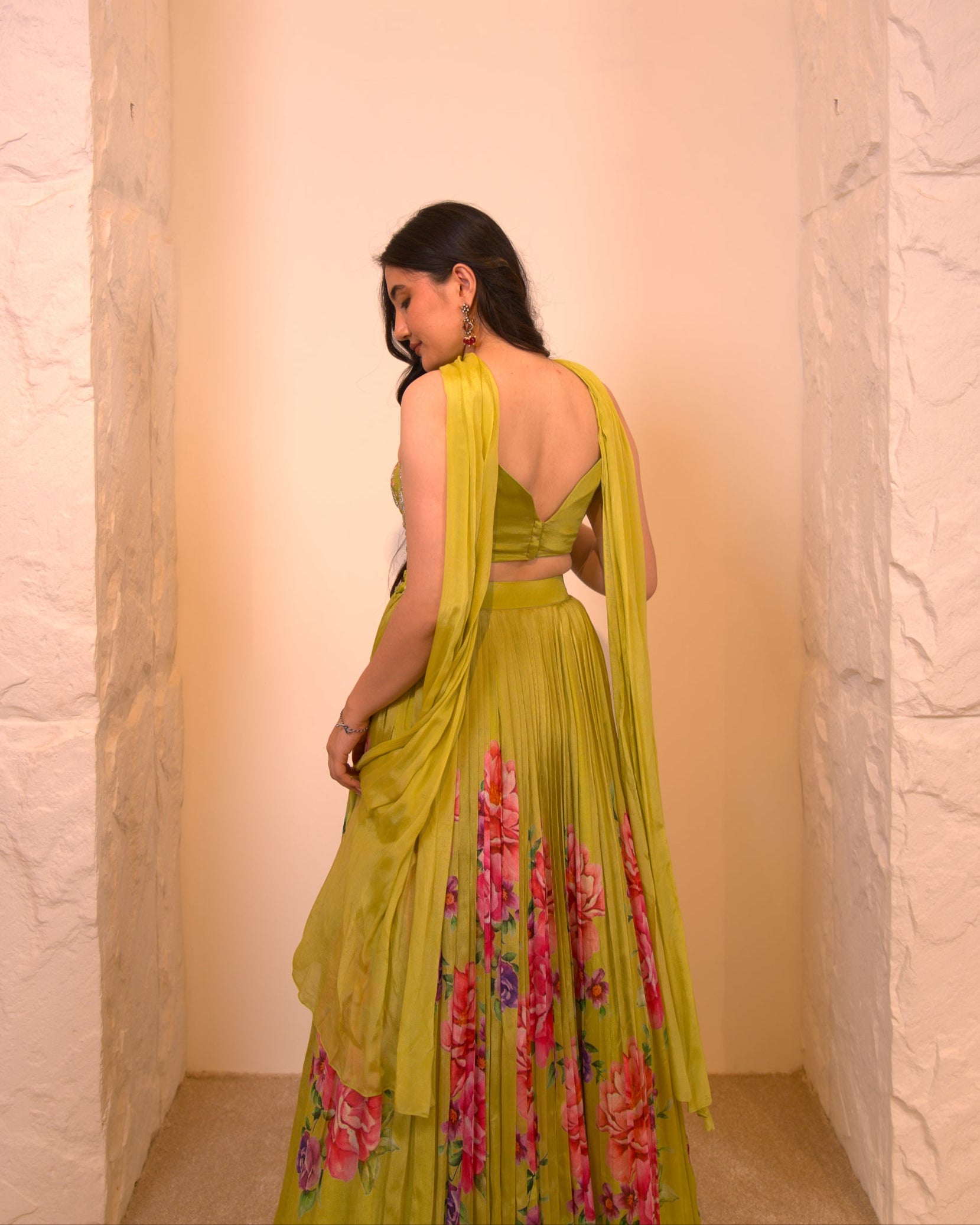 A lush green lehenga adorned with delicate floral embroidery, evoking a garden in bloom. The back petal neckline adds a sculptural touch, blending elegance with modern artistry.