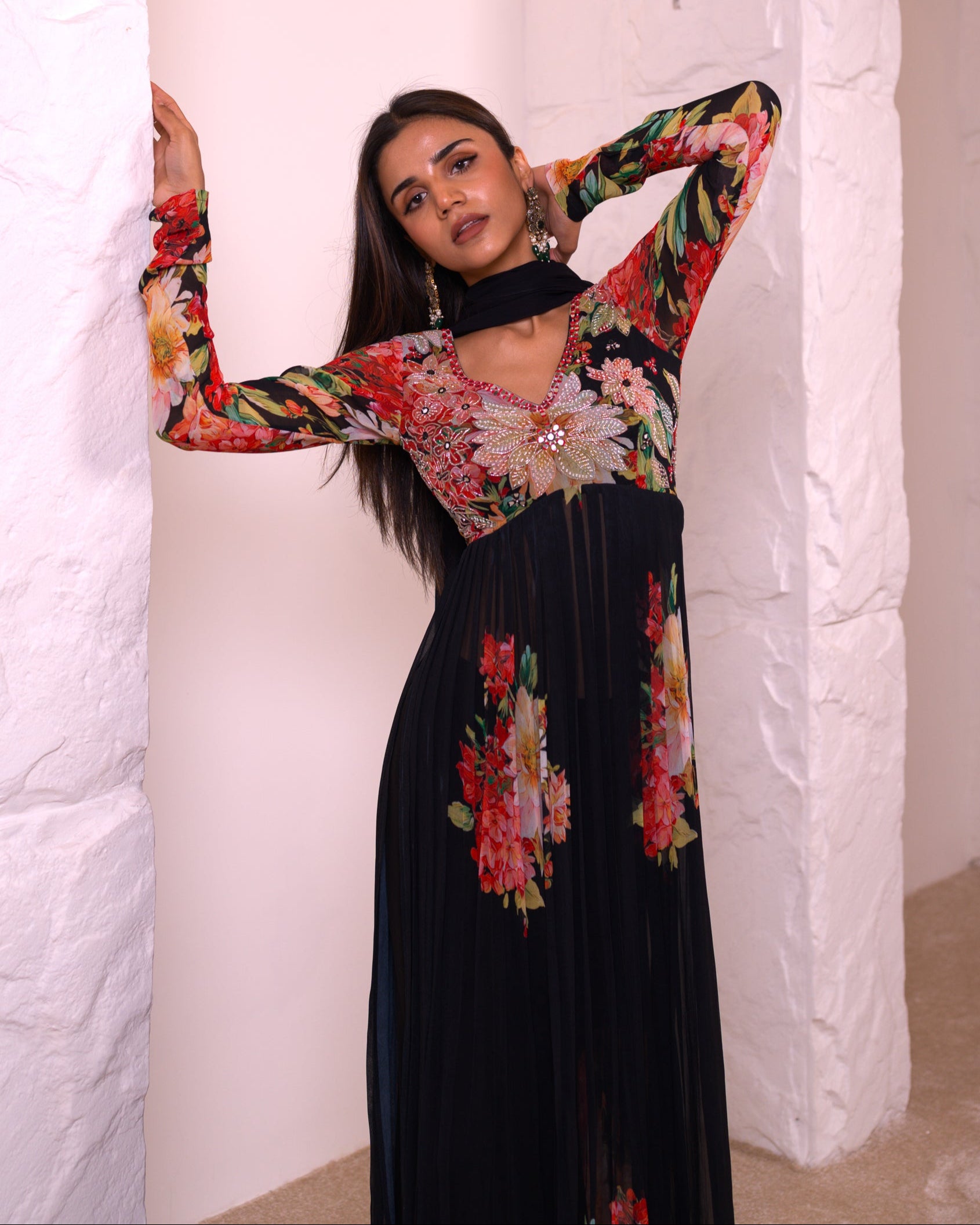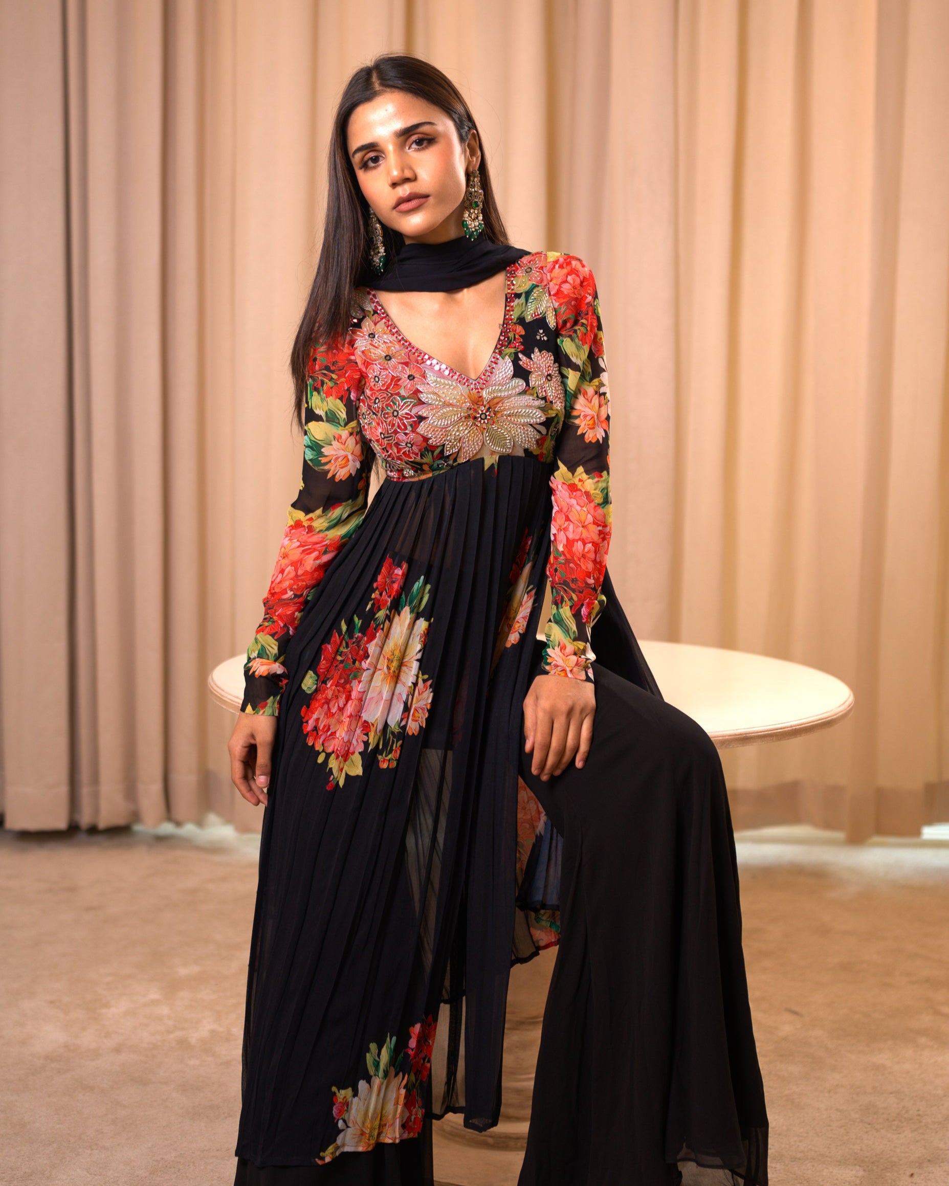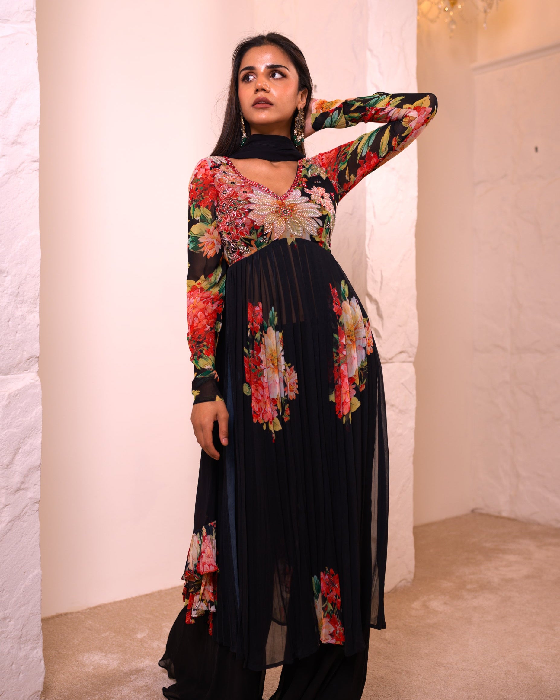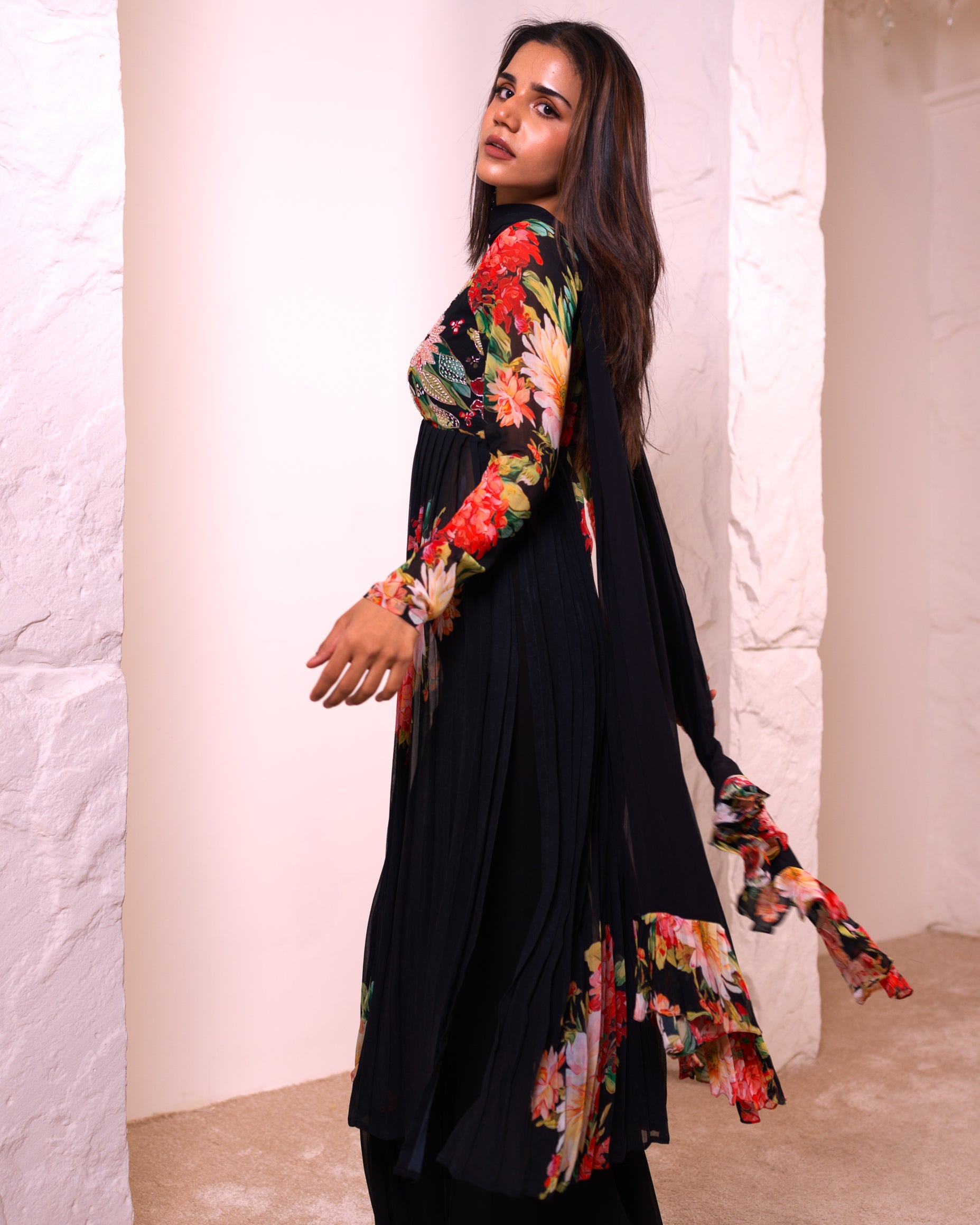 She is a long floral Kurti paired with embroidered pants and a dupatta would be perfect for summer nights, offering a blend of elegance and comfort. The breathable fabric of the kurti and pants, combined with the lightweight dupatta, ensures you stay cool while enjoying the warm evening breeze. The floral design adds a touch of freshness, making it an ideal choice for summer soirées or casual gatherings under the stars.