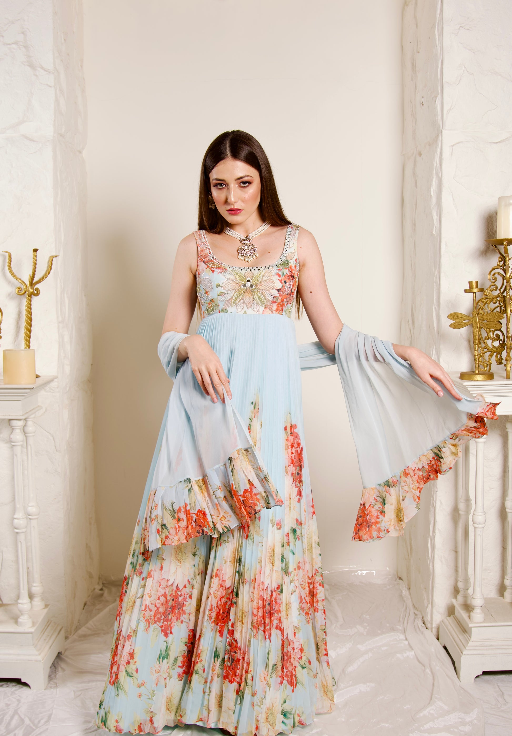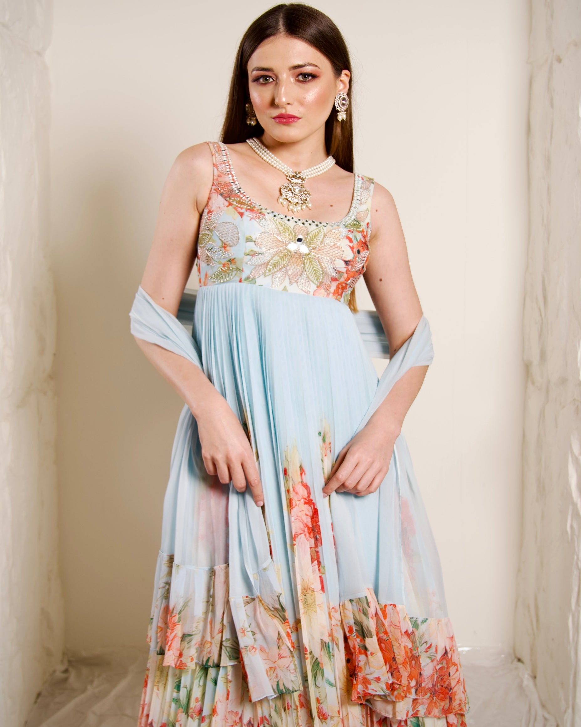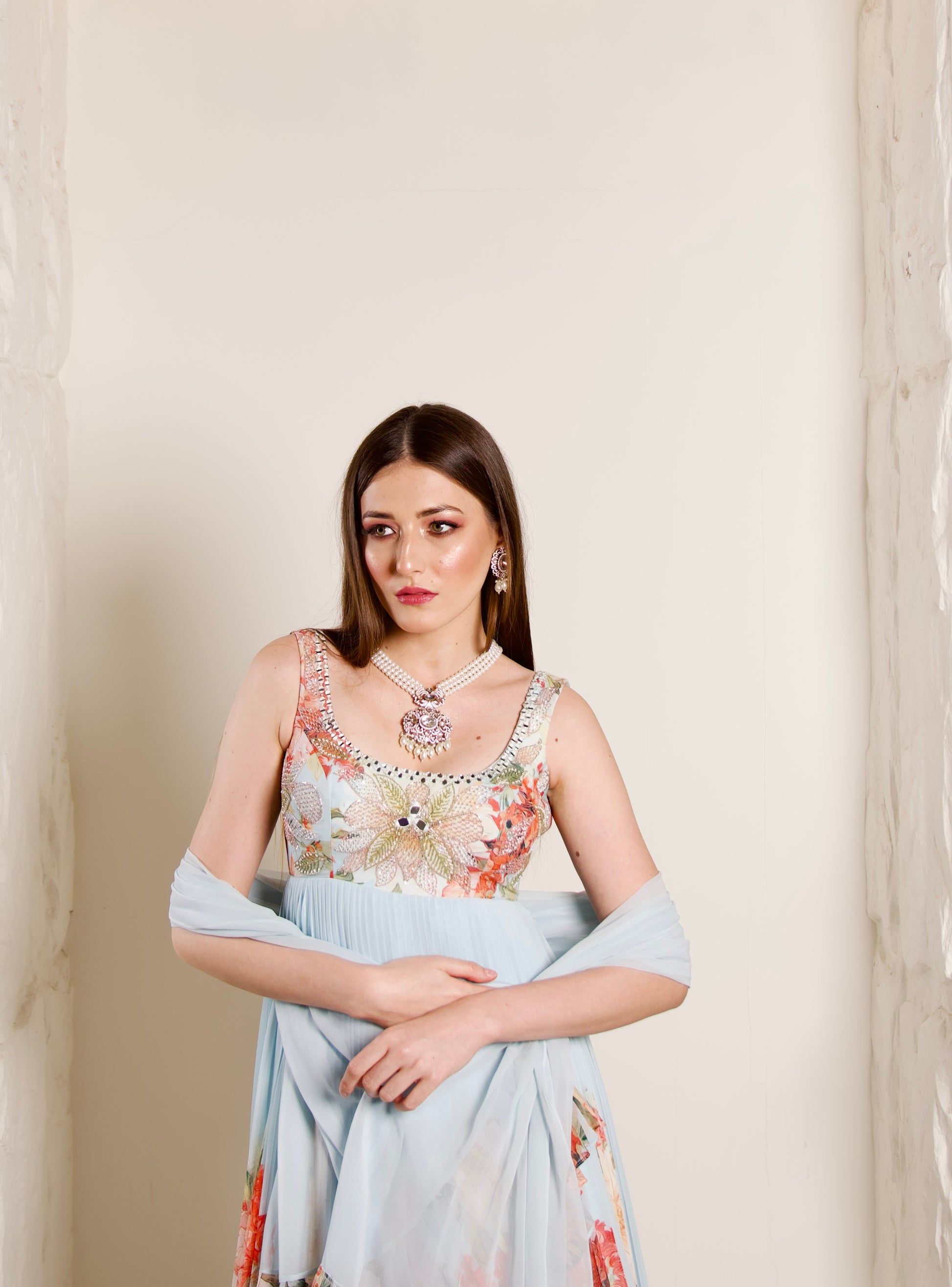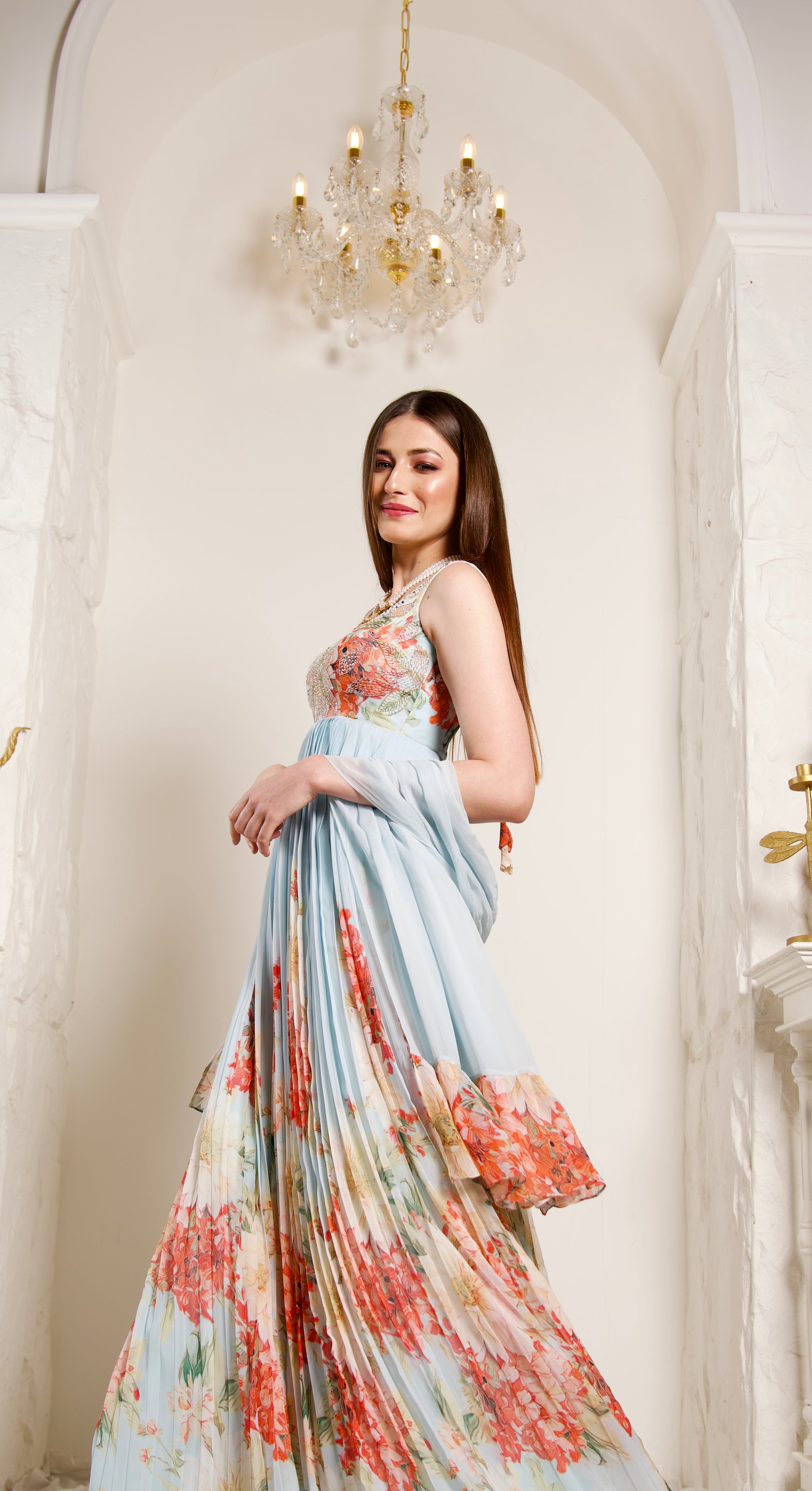 A dreamy pastel blue gown adorned with delicate floral prints and intricate embroidery perfect for a graceful, ethereal look.