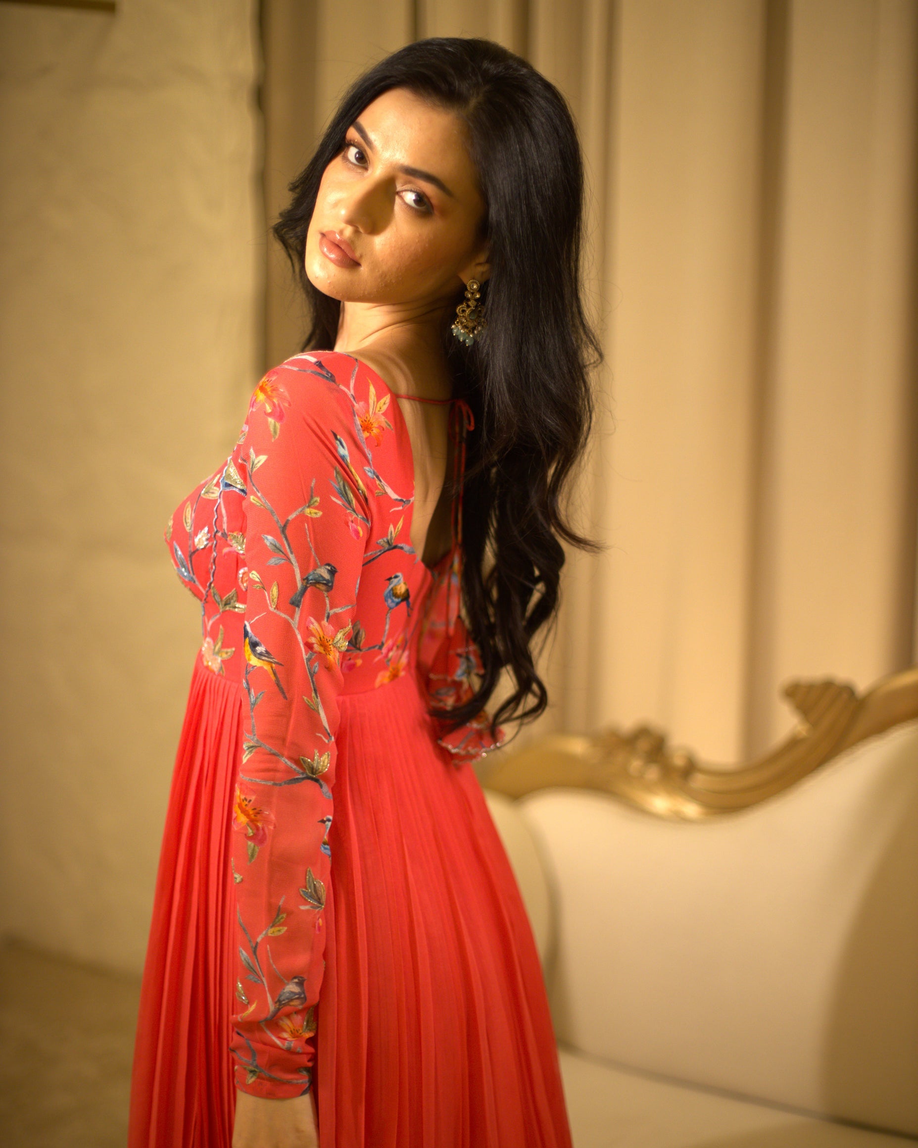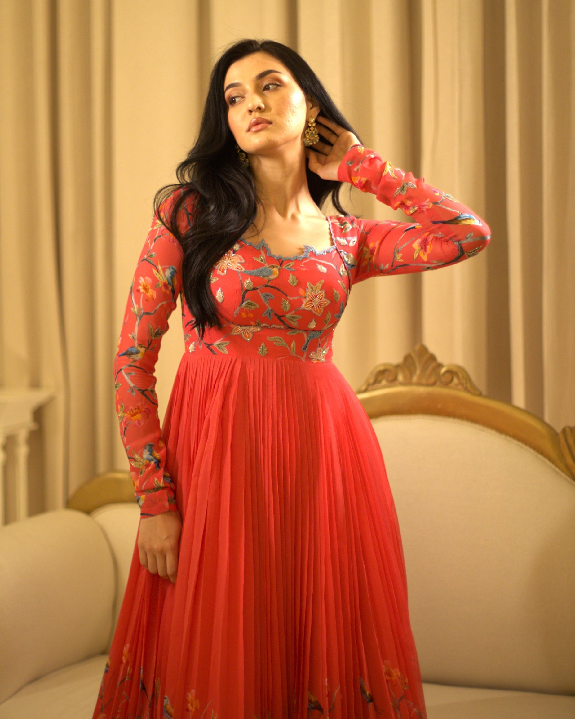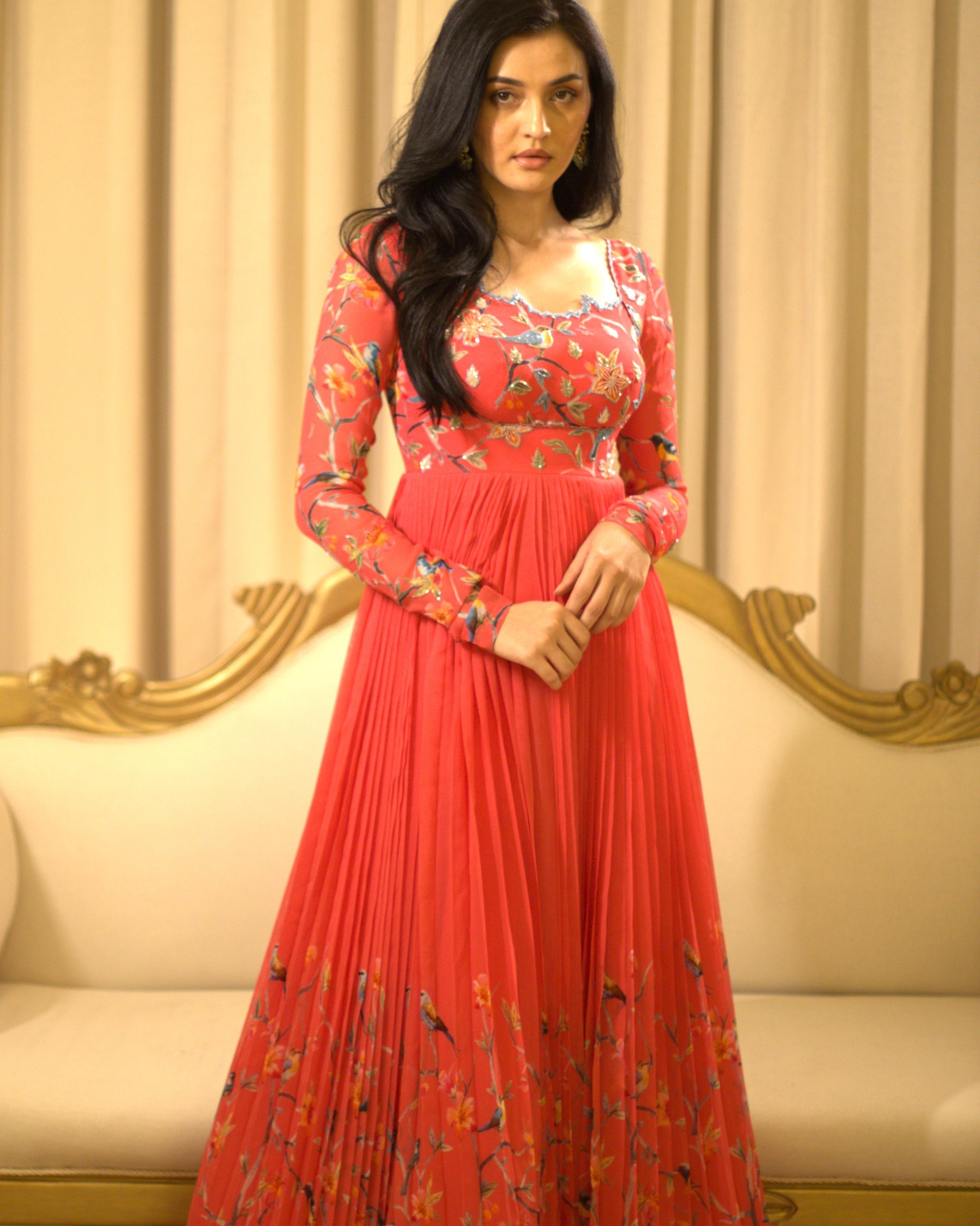 She's a pink hand embroidered georgette gown with fun embroidery details.