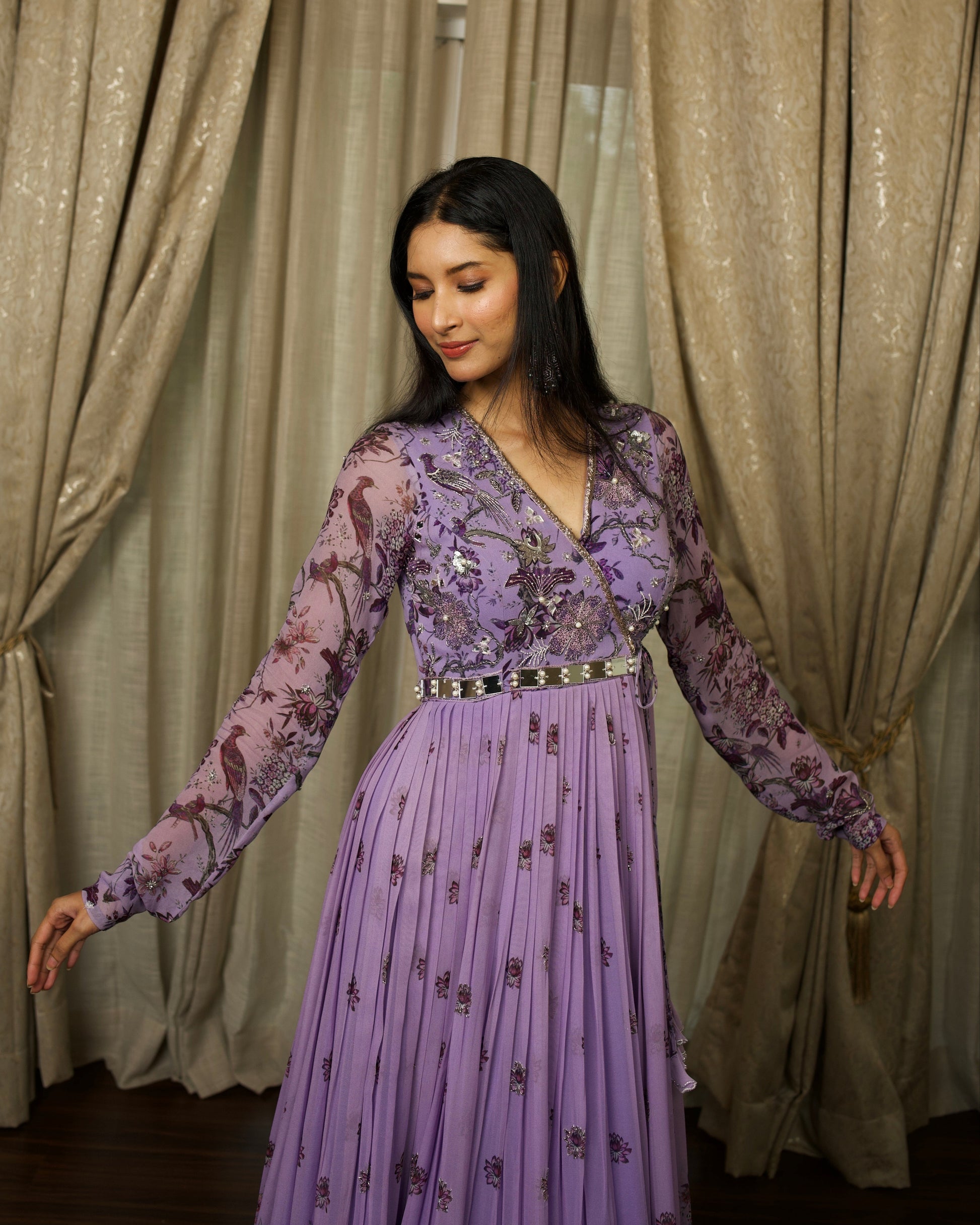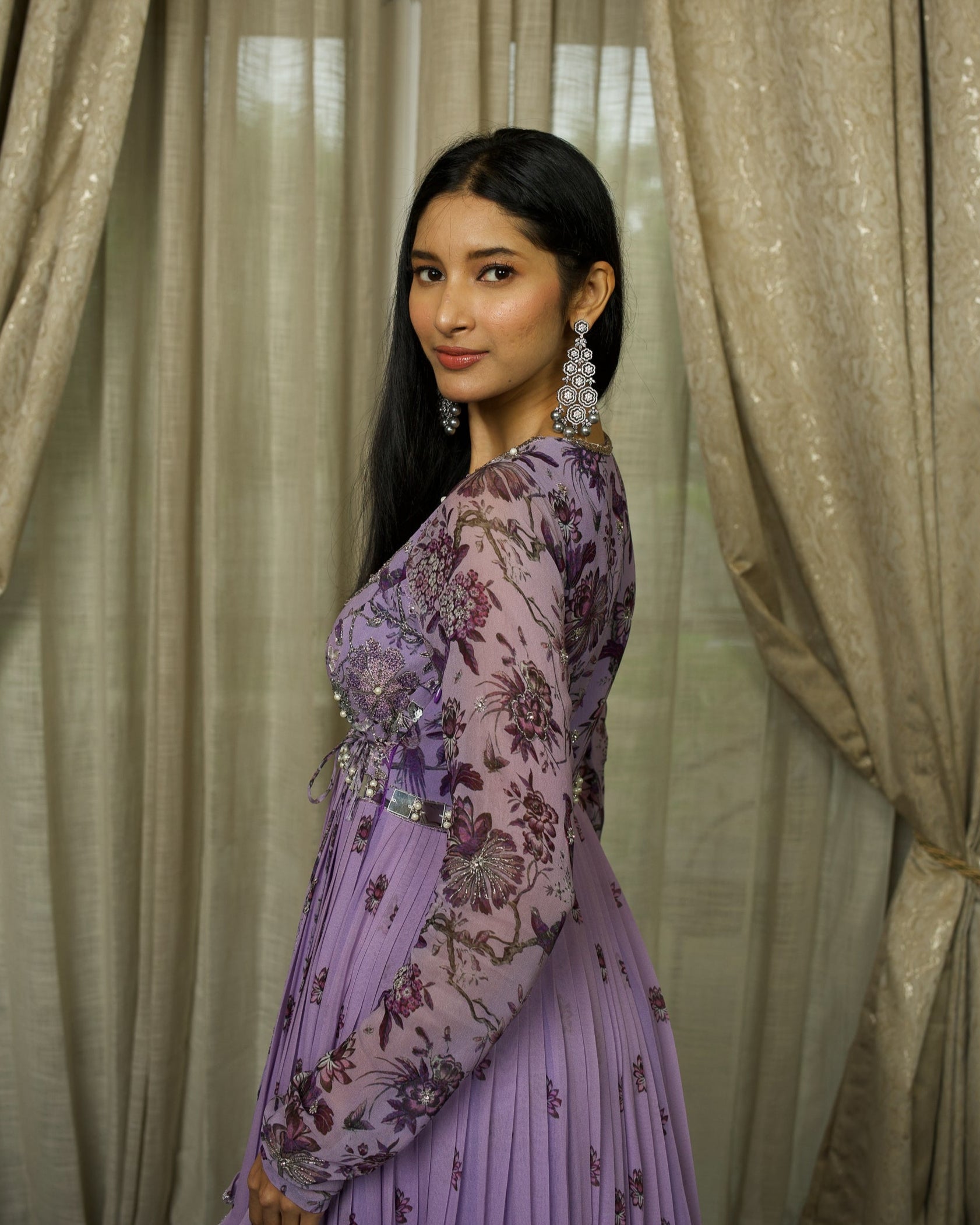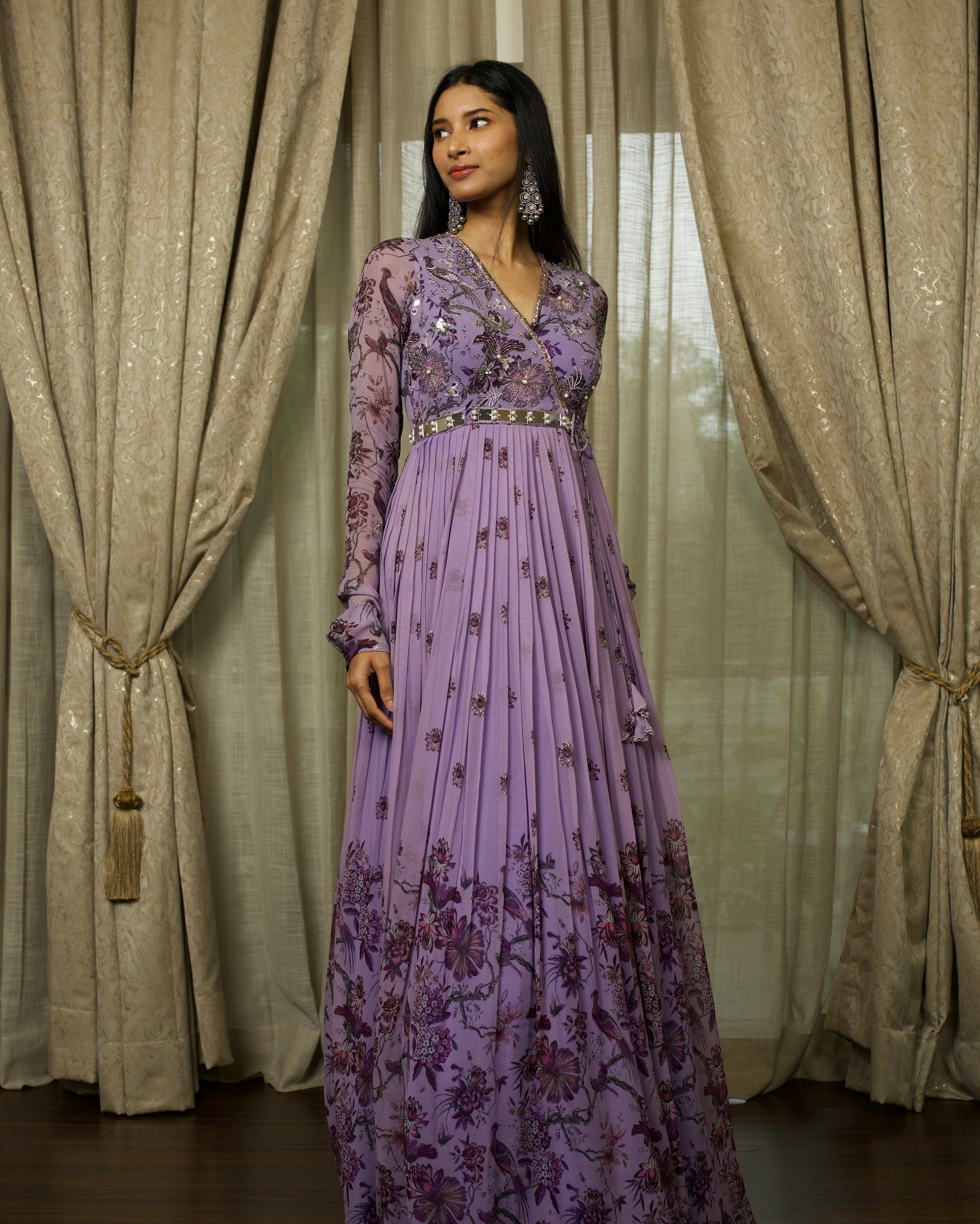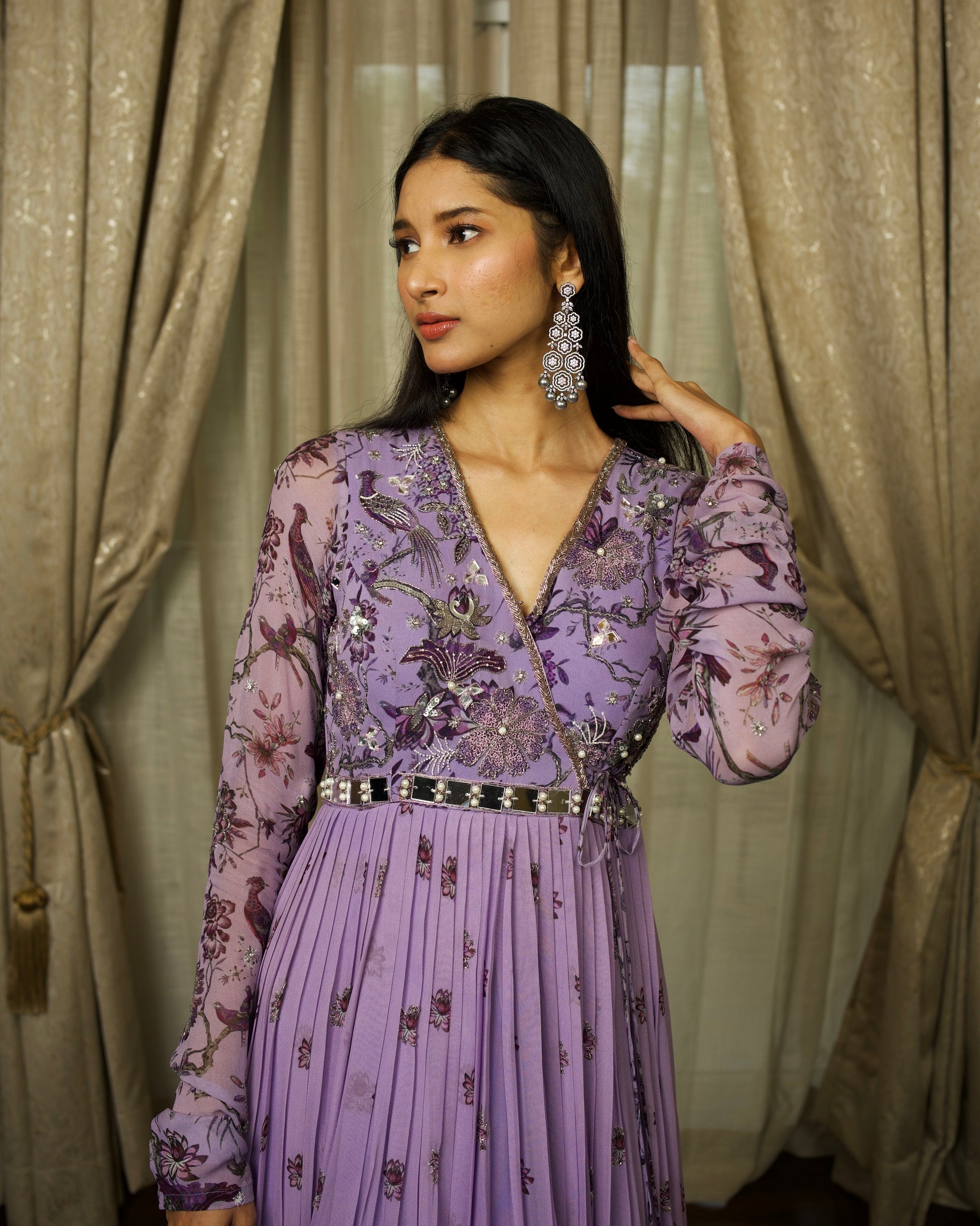A stunning lavender gown adorned with intricate mirror work and delicate pearl embroidery. Perfect for special occasions, it combines elegance and glamour, ensuring you shine effortlessly.