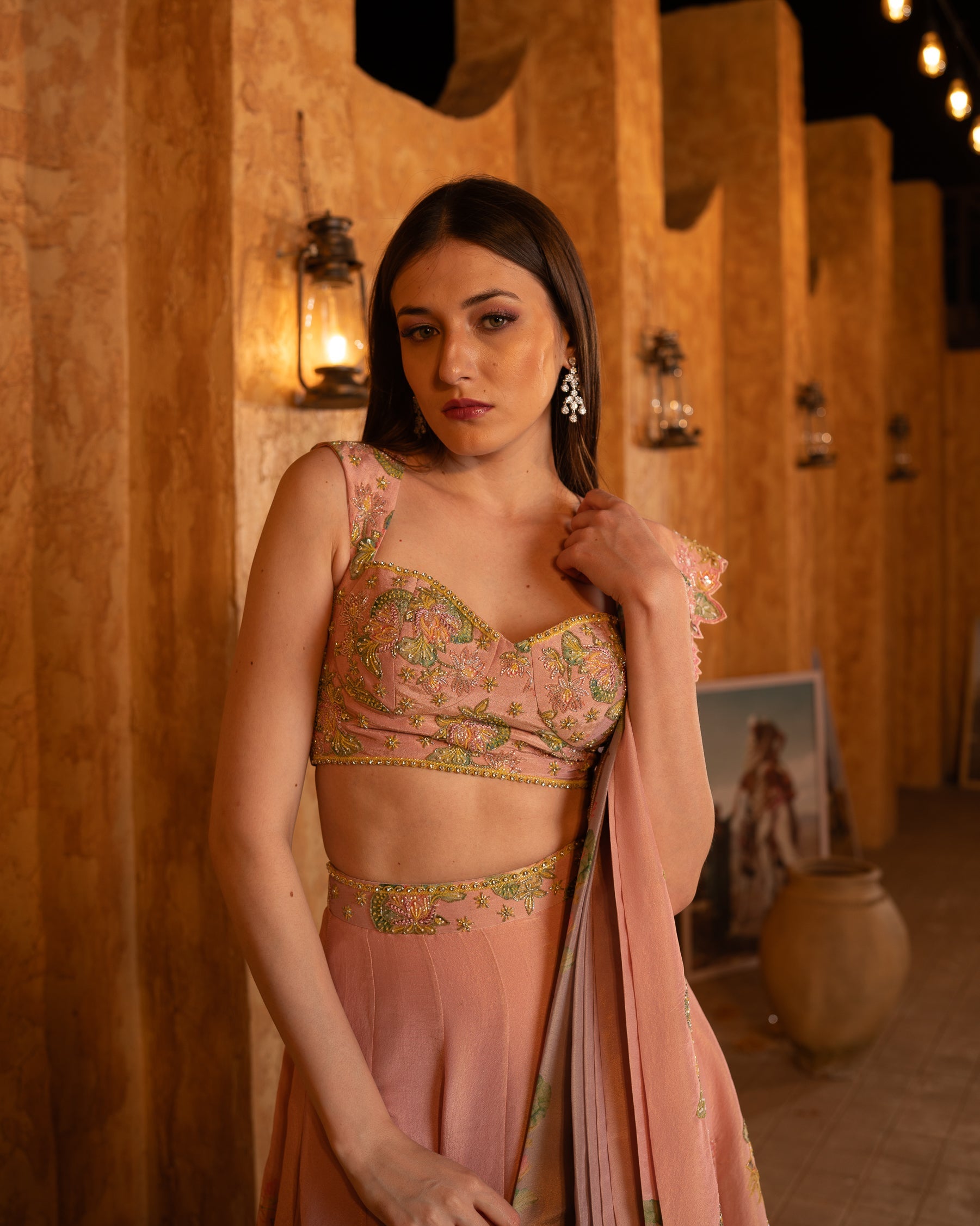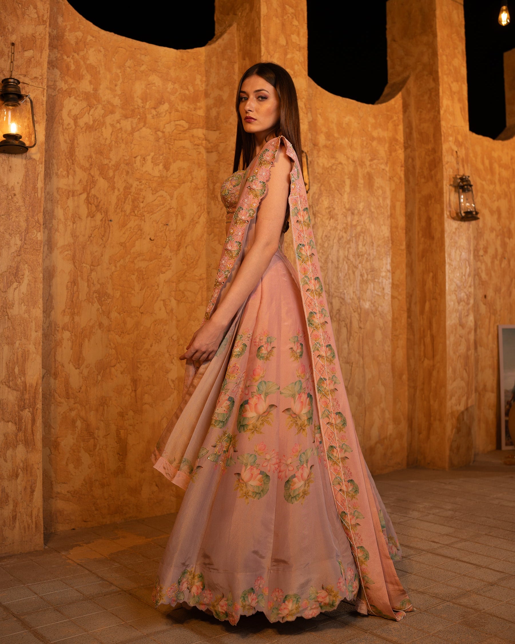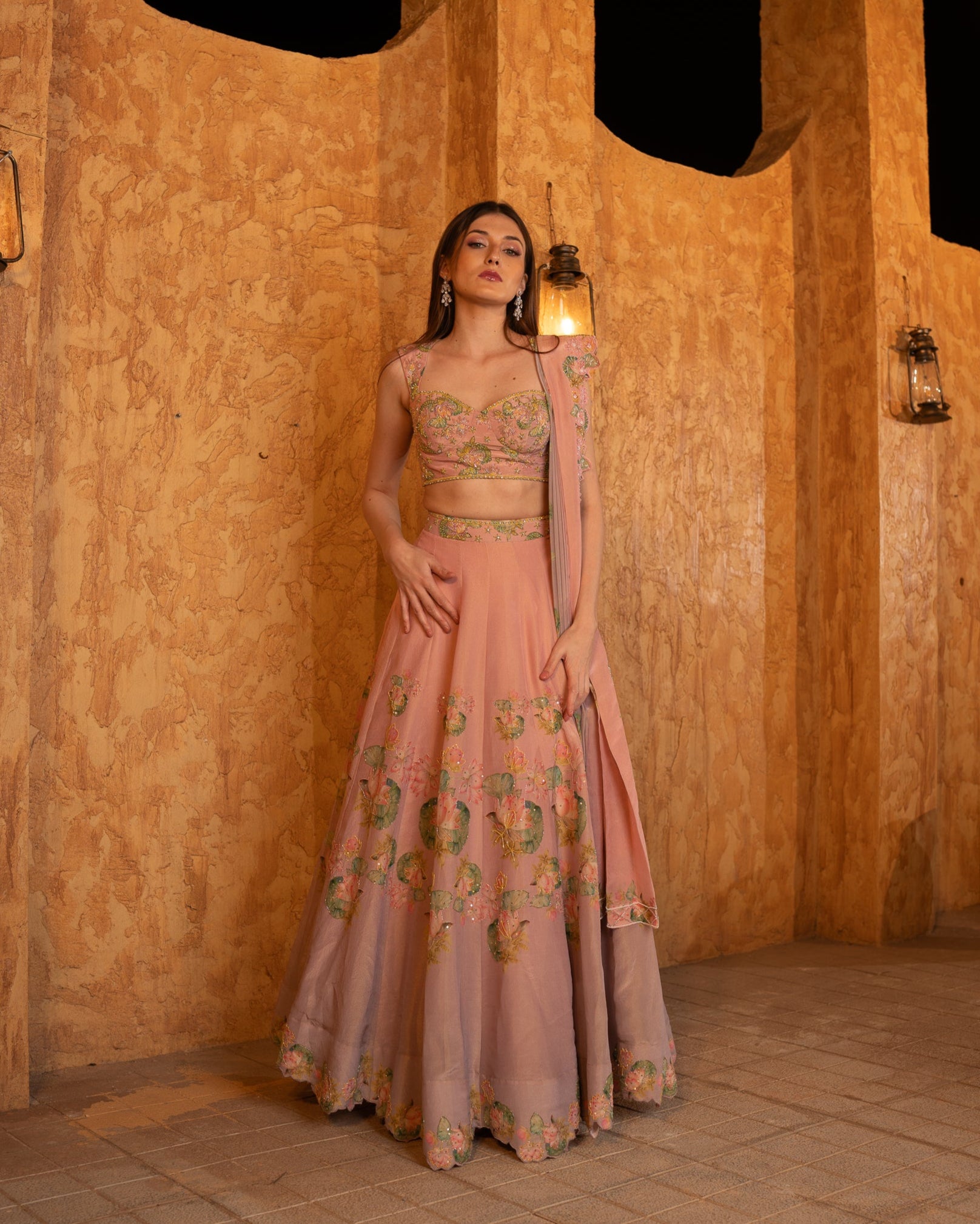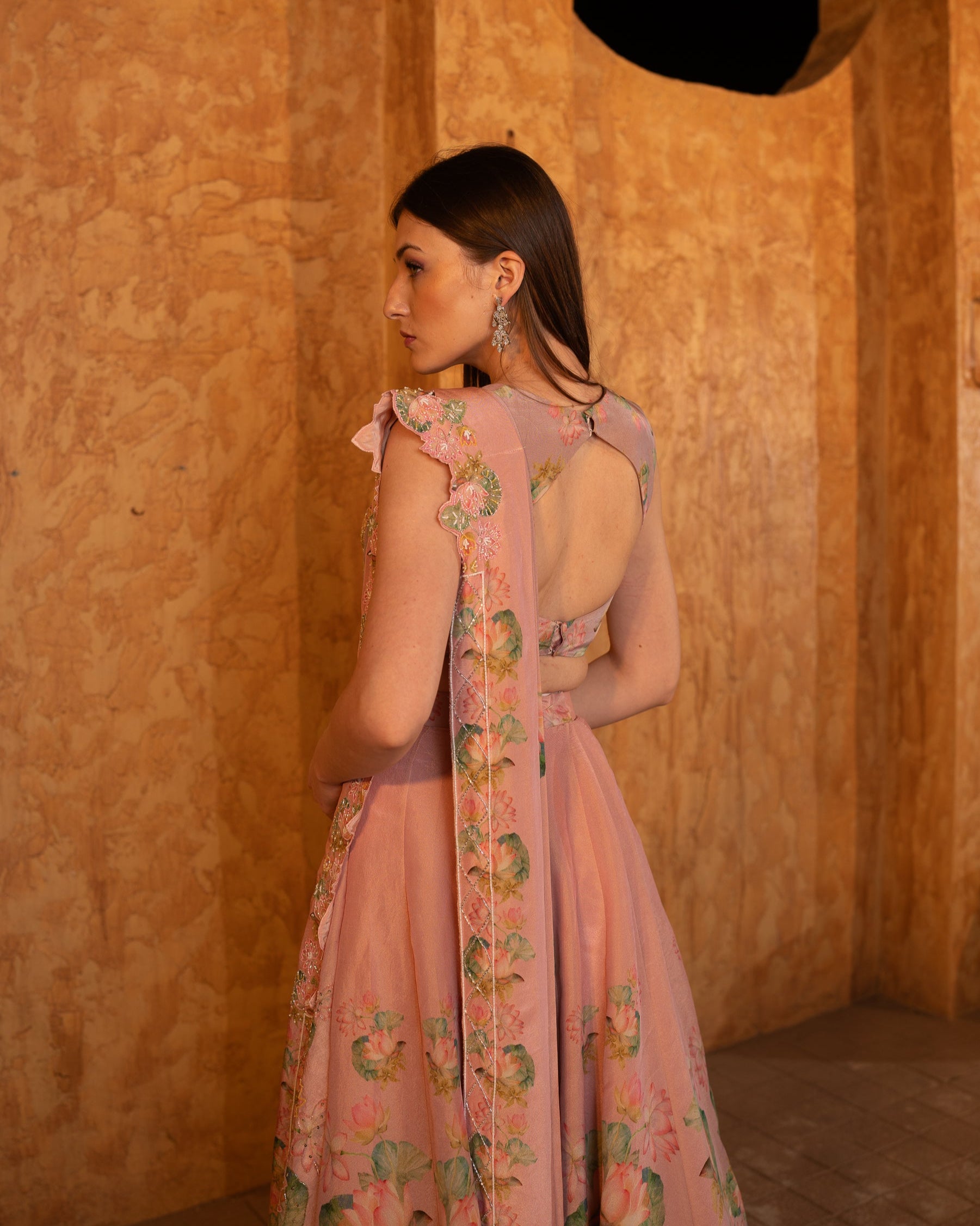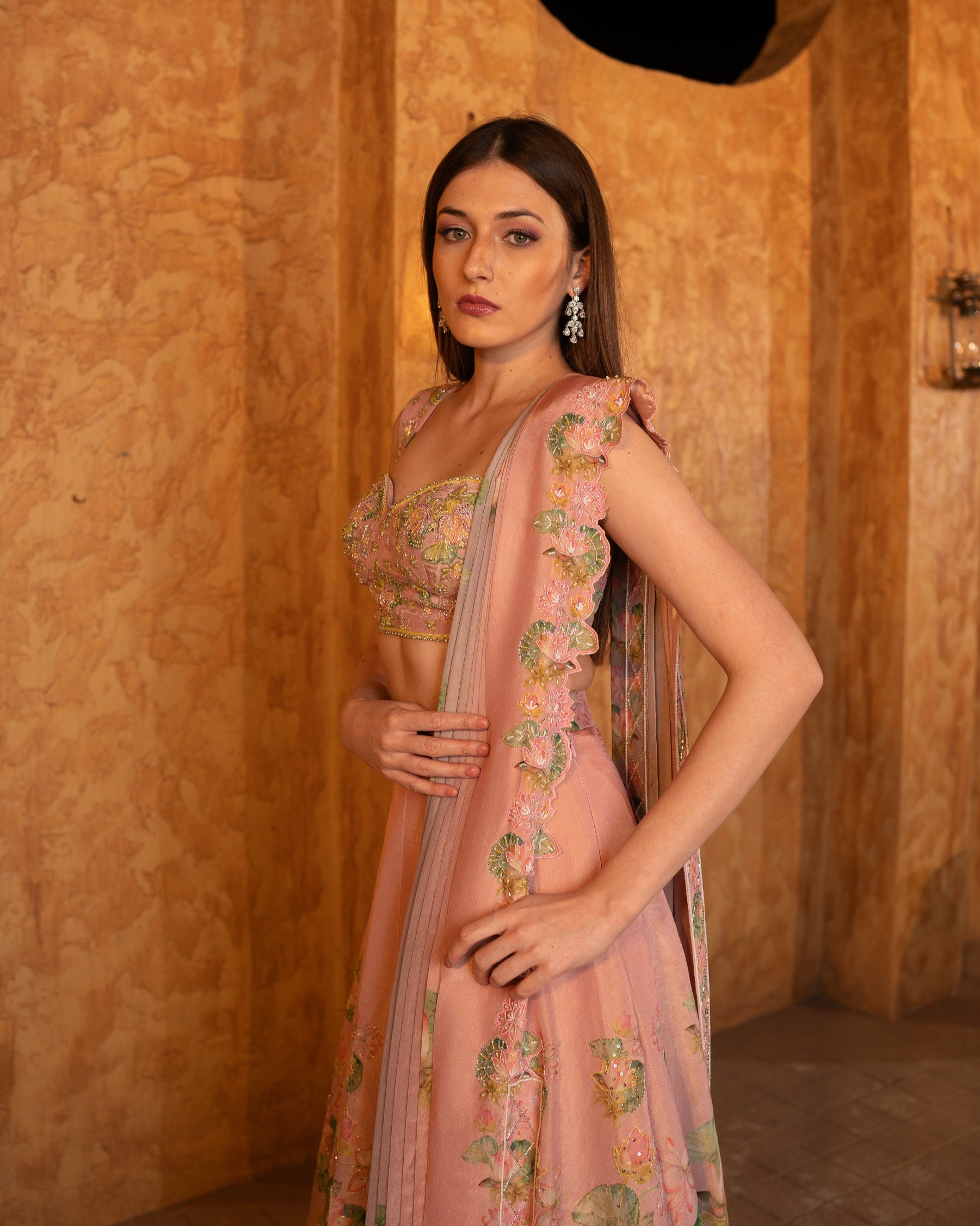 This enchanting tissue lehenga blends delicate shades of baby pink with a soft, dreamy gradient, beautifully complemented by intricate lotus motifs. The subtle shimmer and graceful flow of the fabric make it a timeless piece, perfect for elegant celebrations.