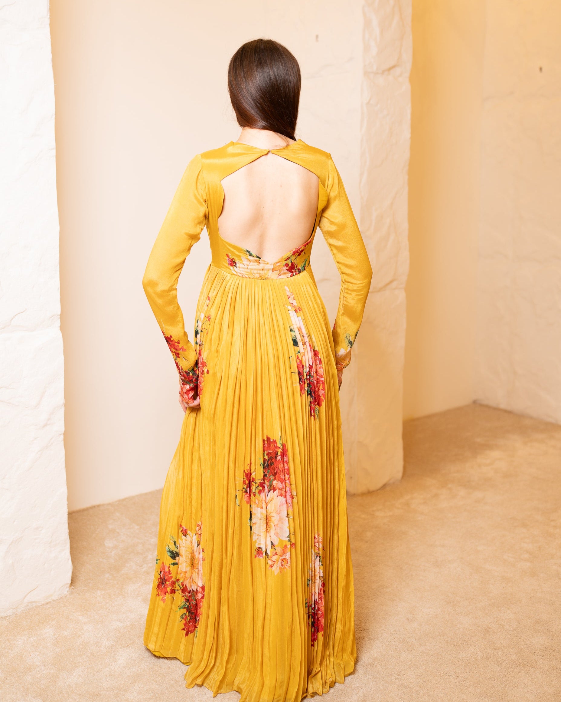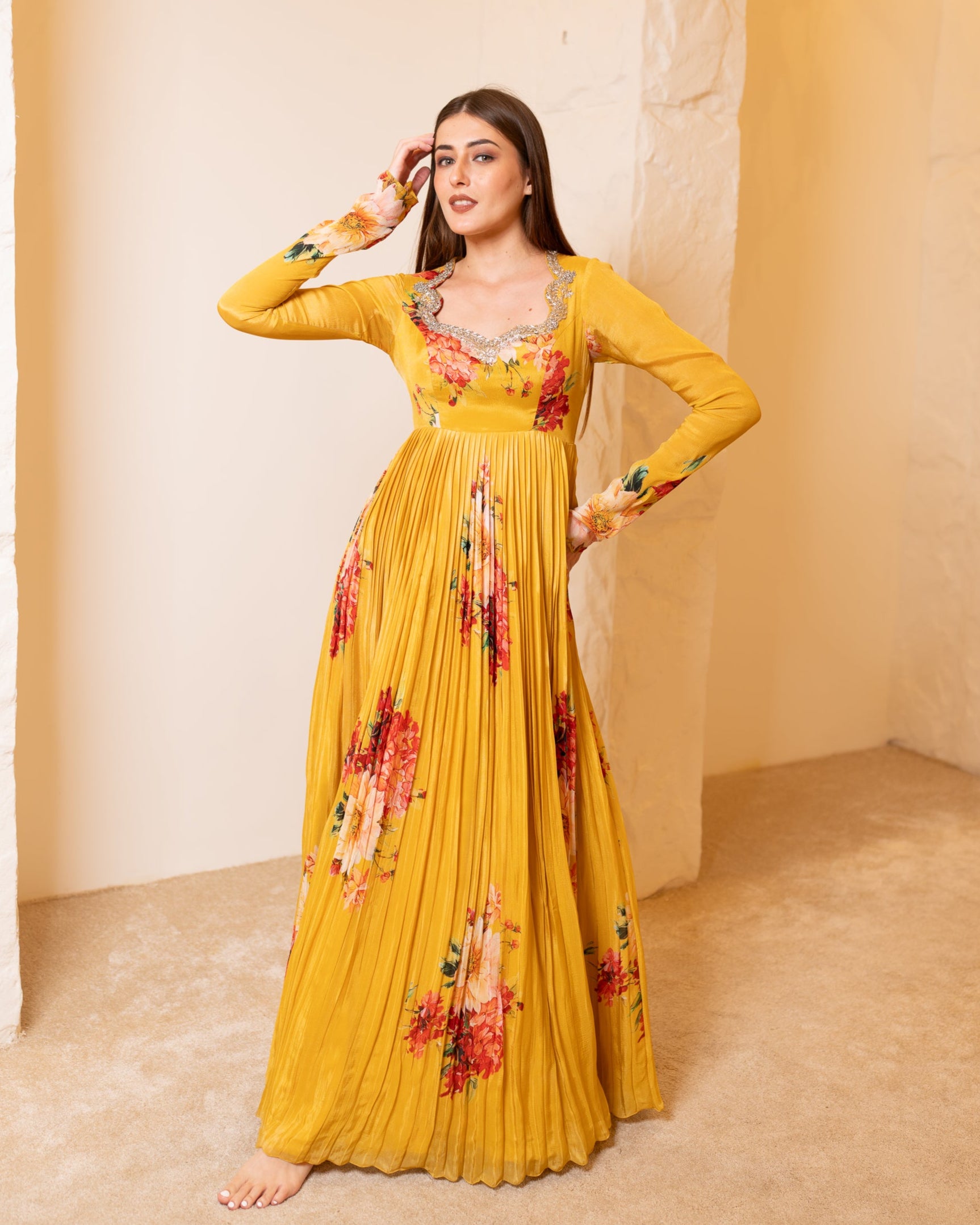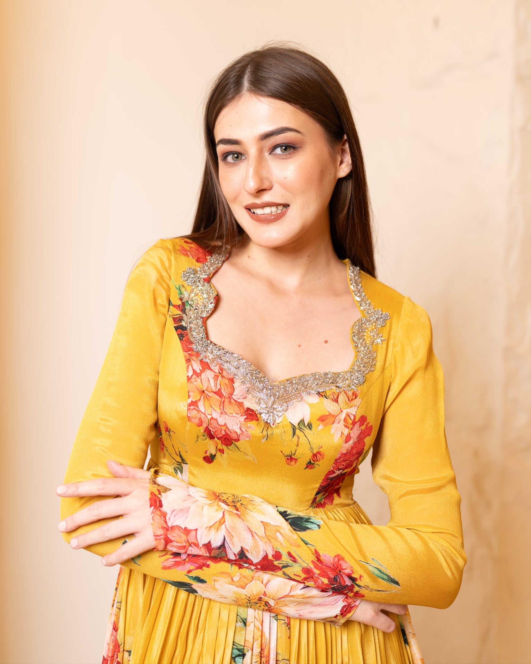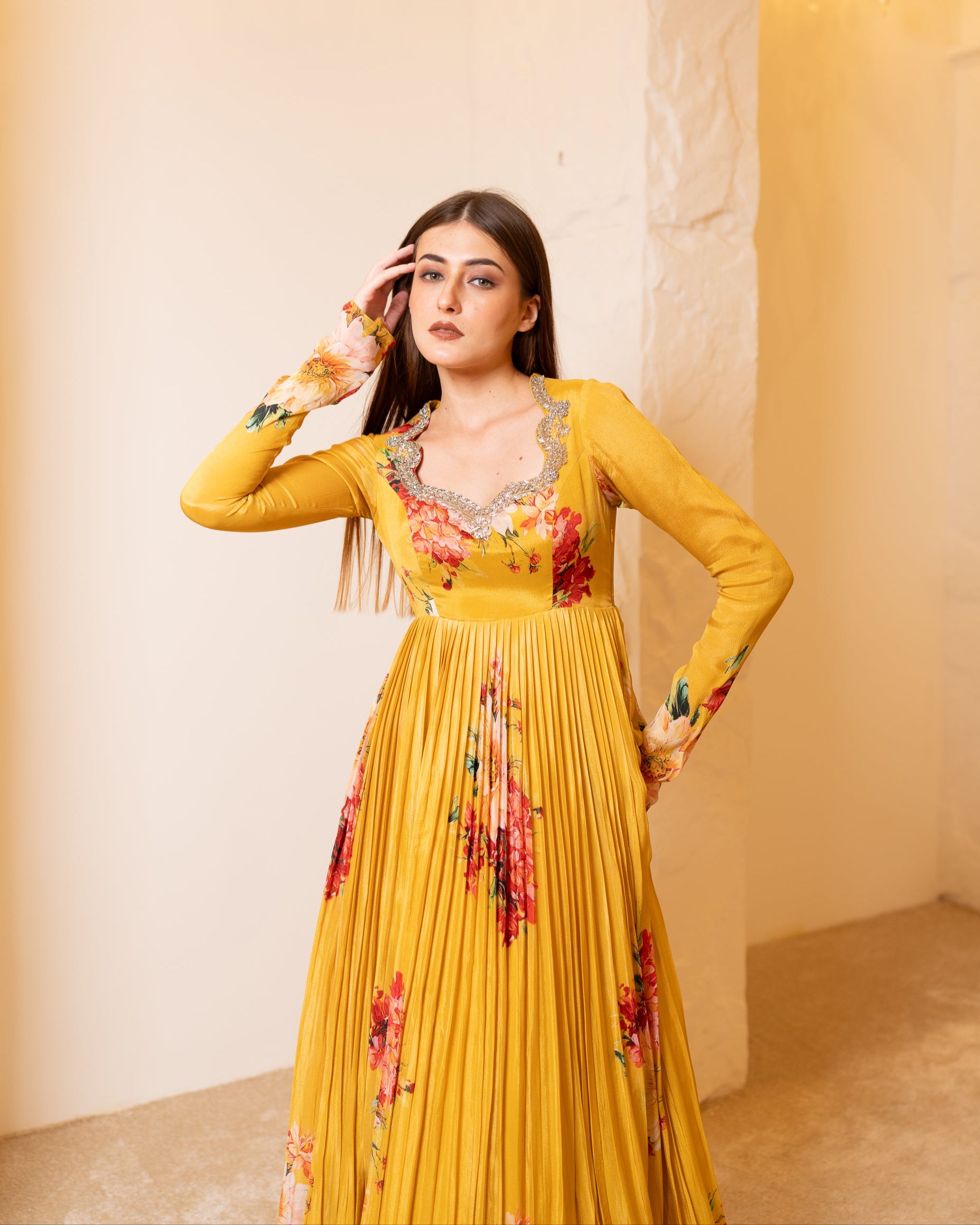 She's a mustard bright yellow gown with floral hints all over the gown, she has a zardosi hand embellishment neckline with cutwork.