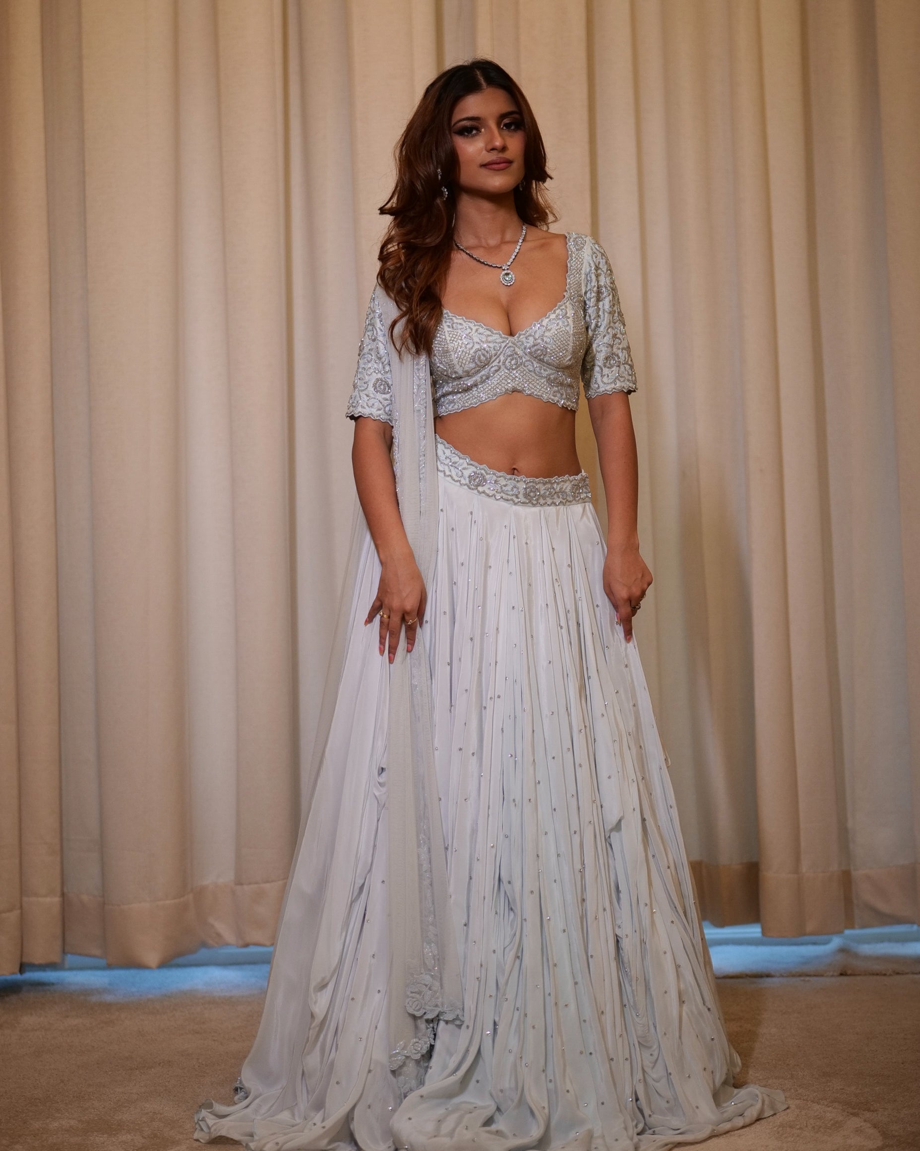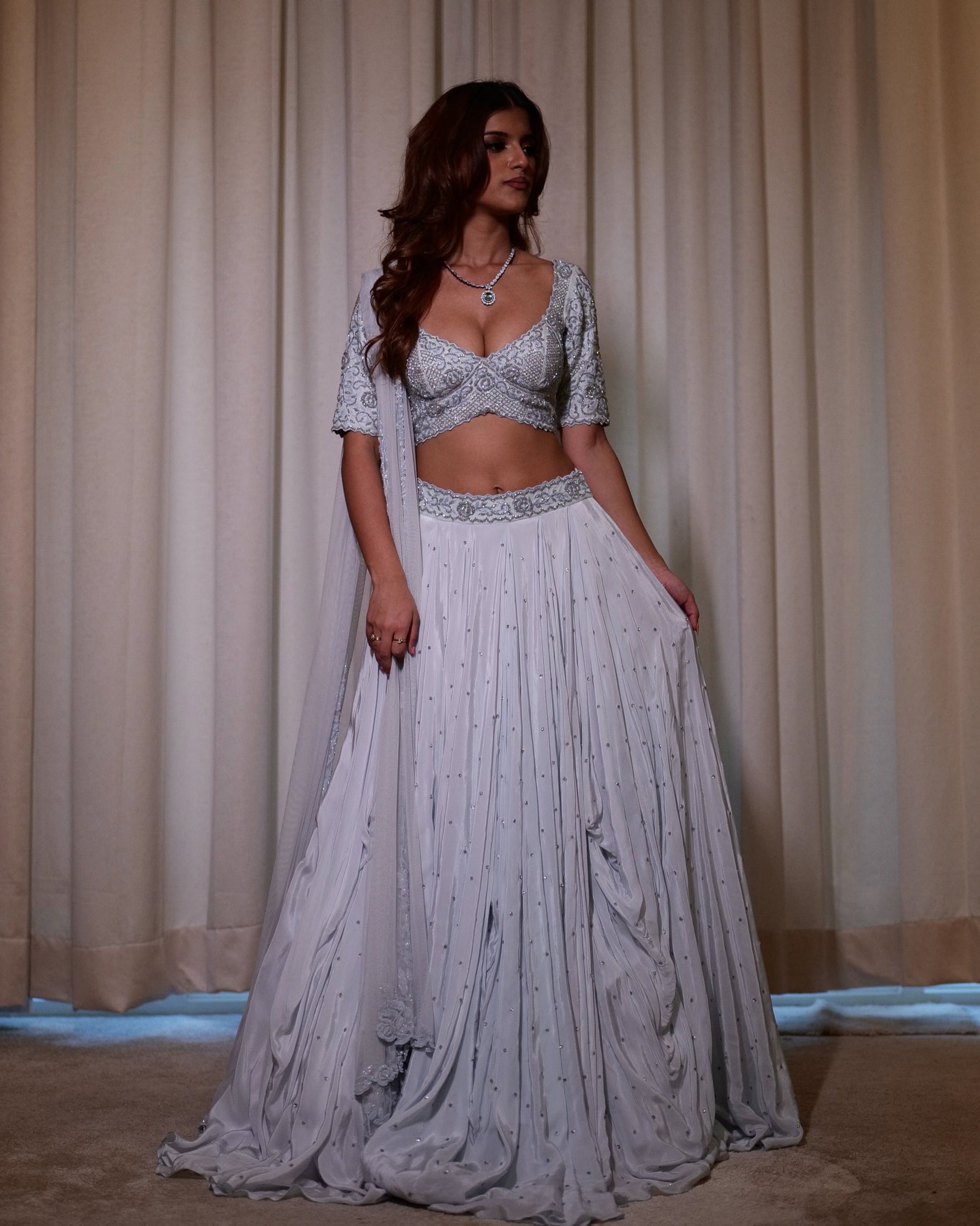 A dreamy lehenga set in a soft icy hue, adorned with delicate embroidery and subtle sequins. Featuring a stylish blouse, a flowing skirt, and a sheer dupatta, this ensemble is perfect for receptions, evening soirées, and grand celebrations.