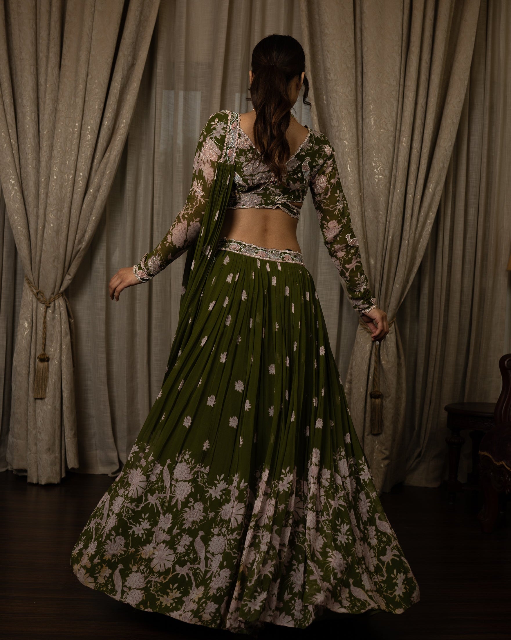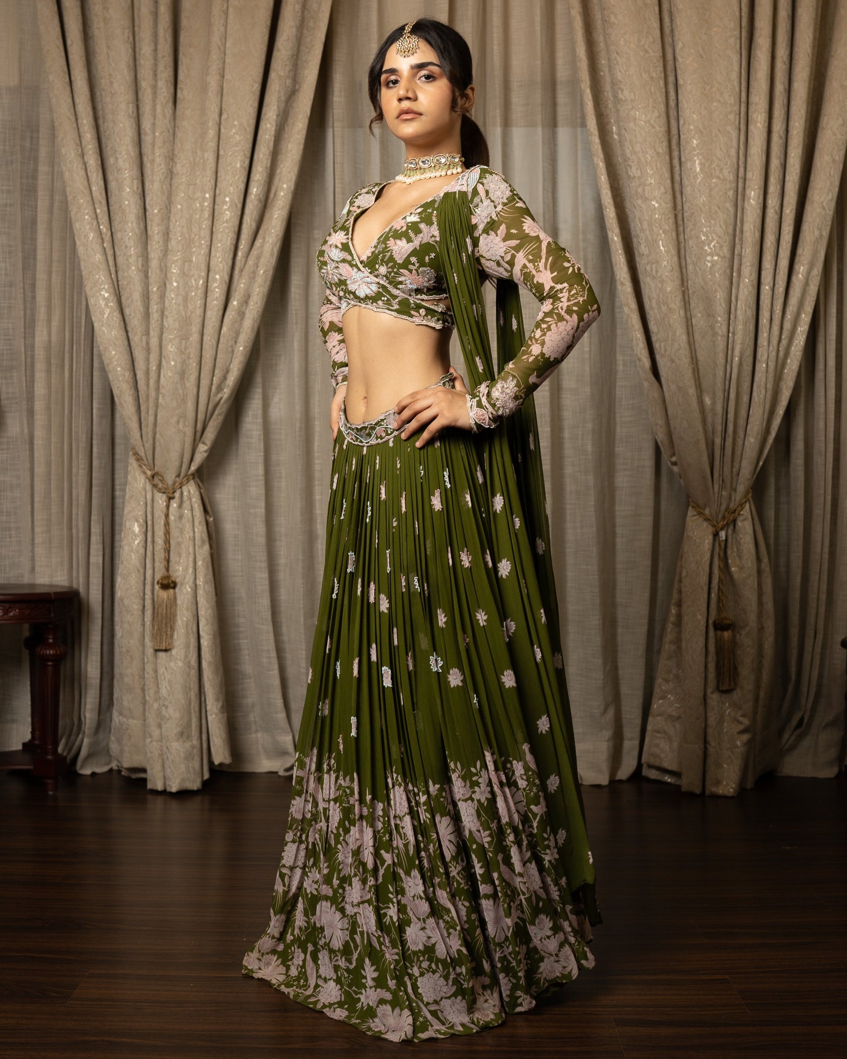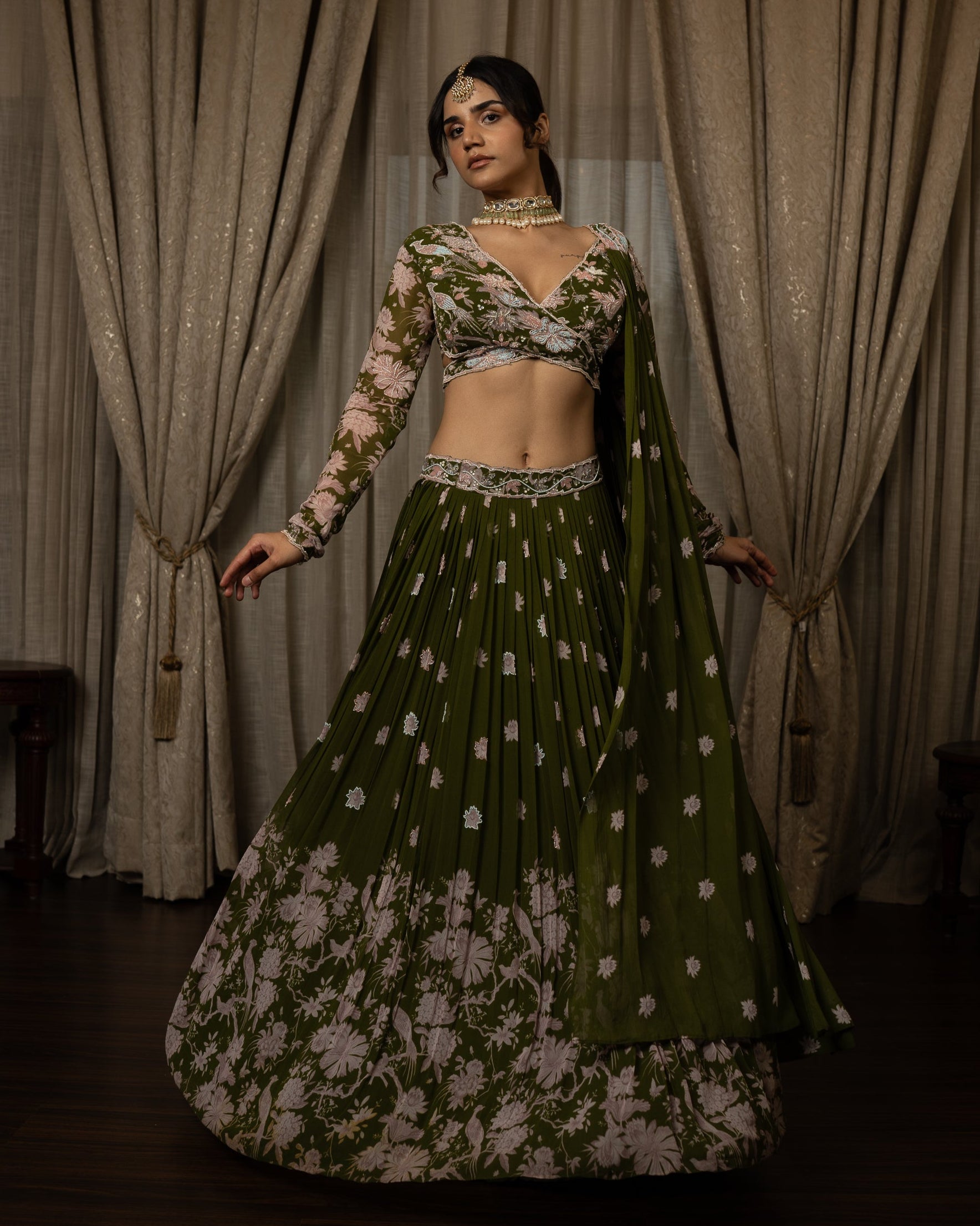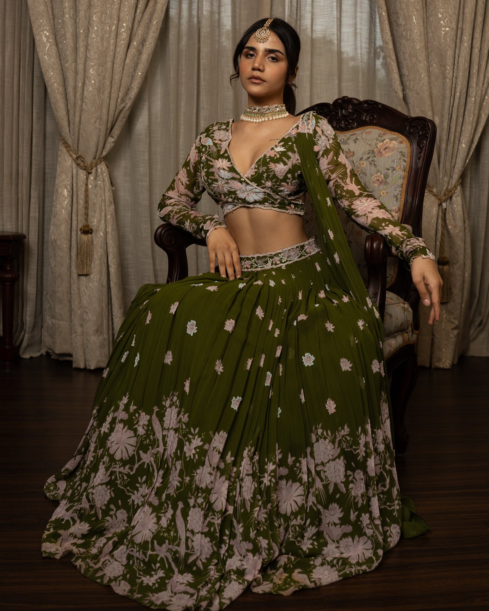 Radiate elegance in our green georgette printed gown, adorned with carefully selected coloured embellishments for a graceful and stunning look.