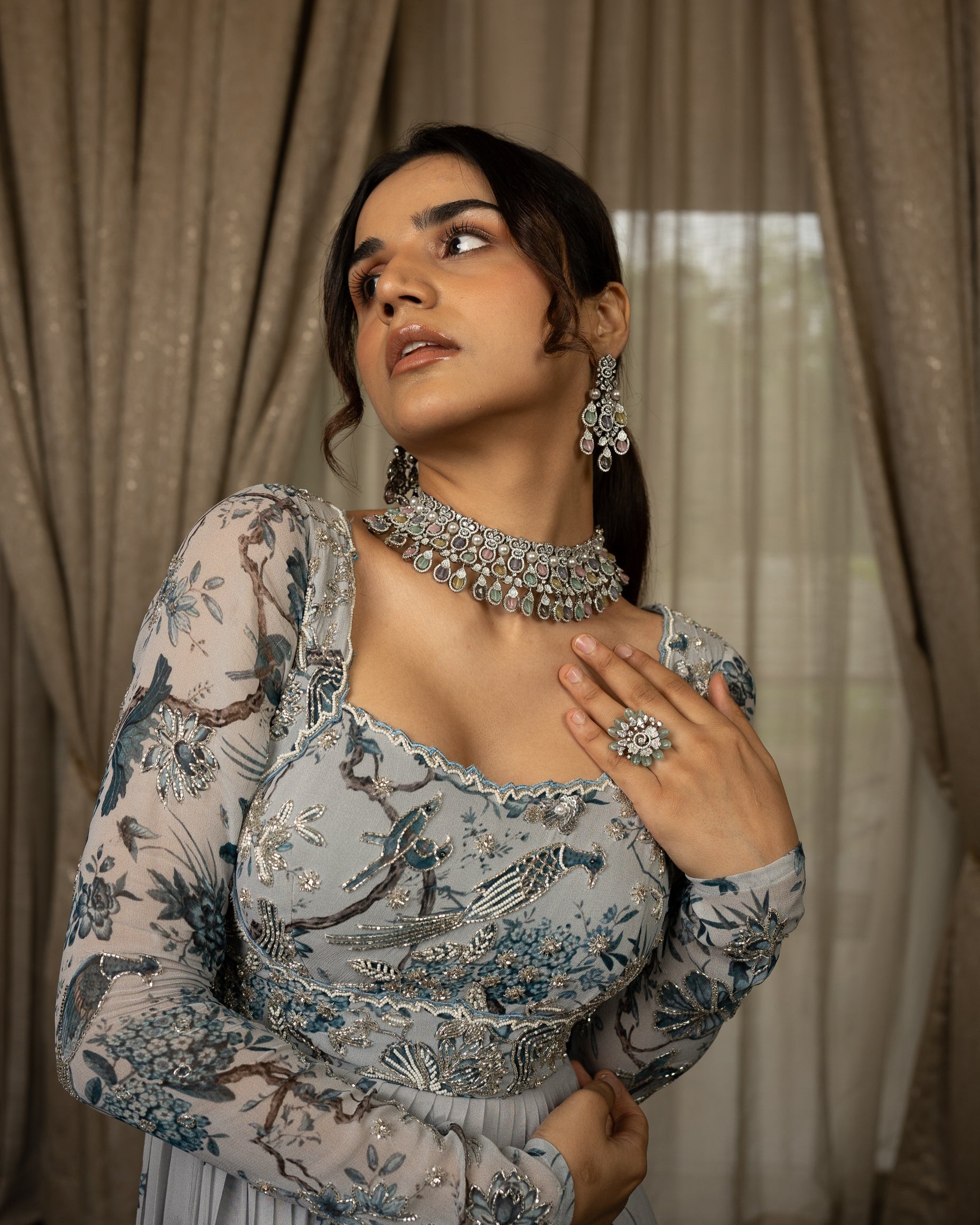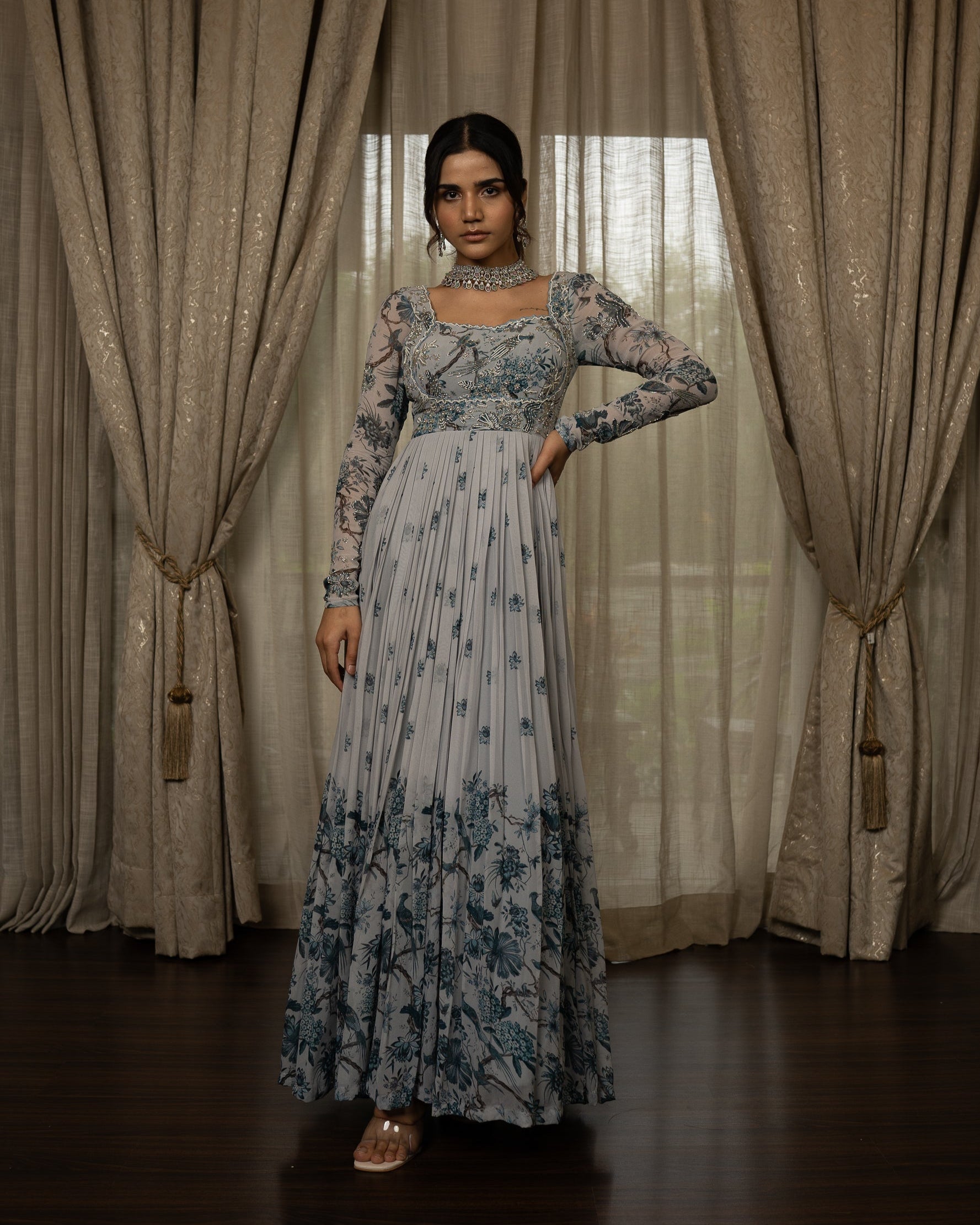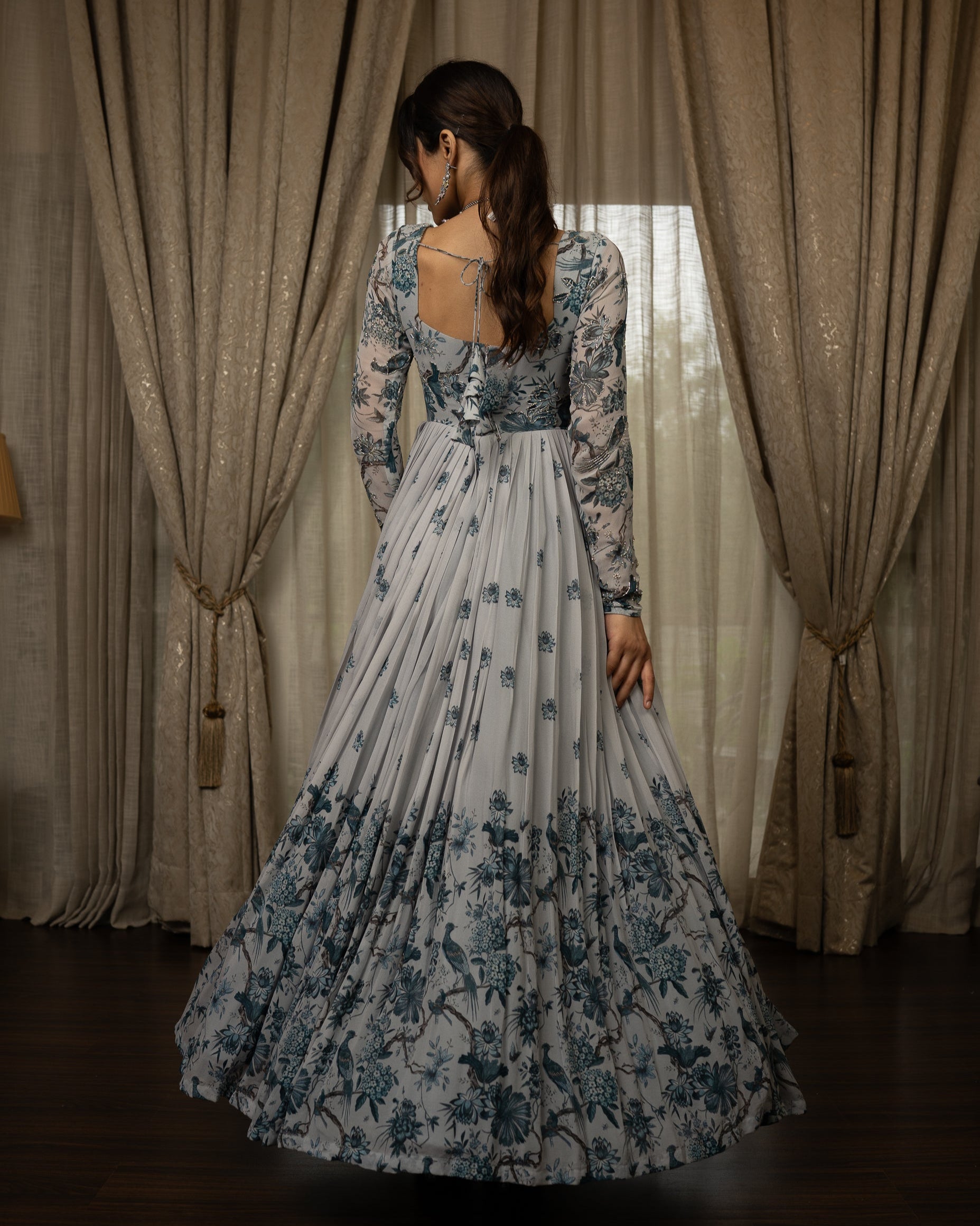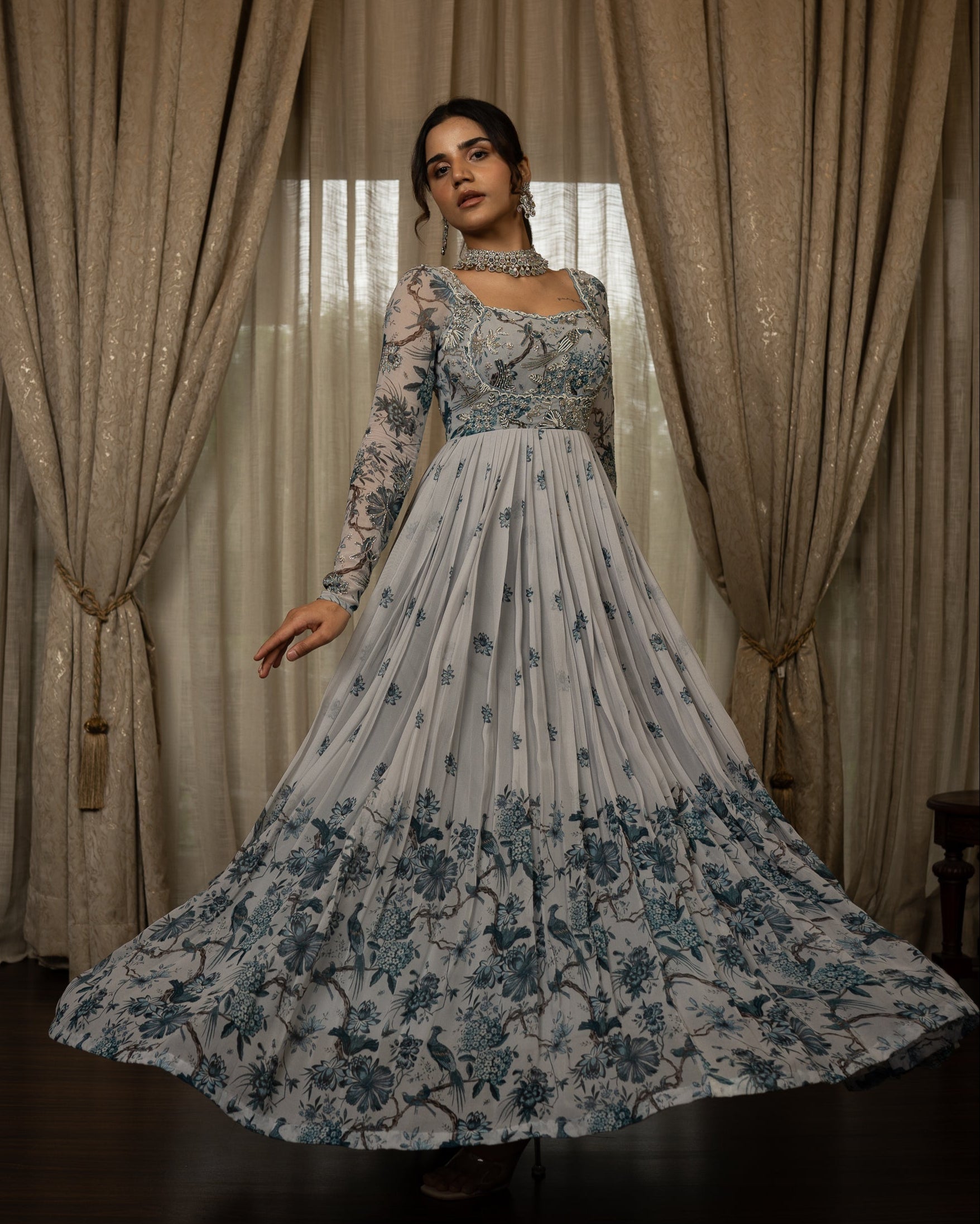Elegant ash blue printed Georgette gown with intricate handwork, blending sophistication with artistic craftsmanship.