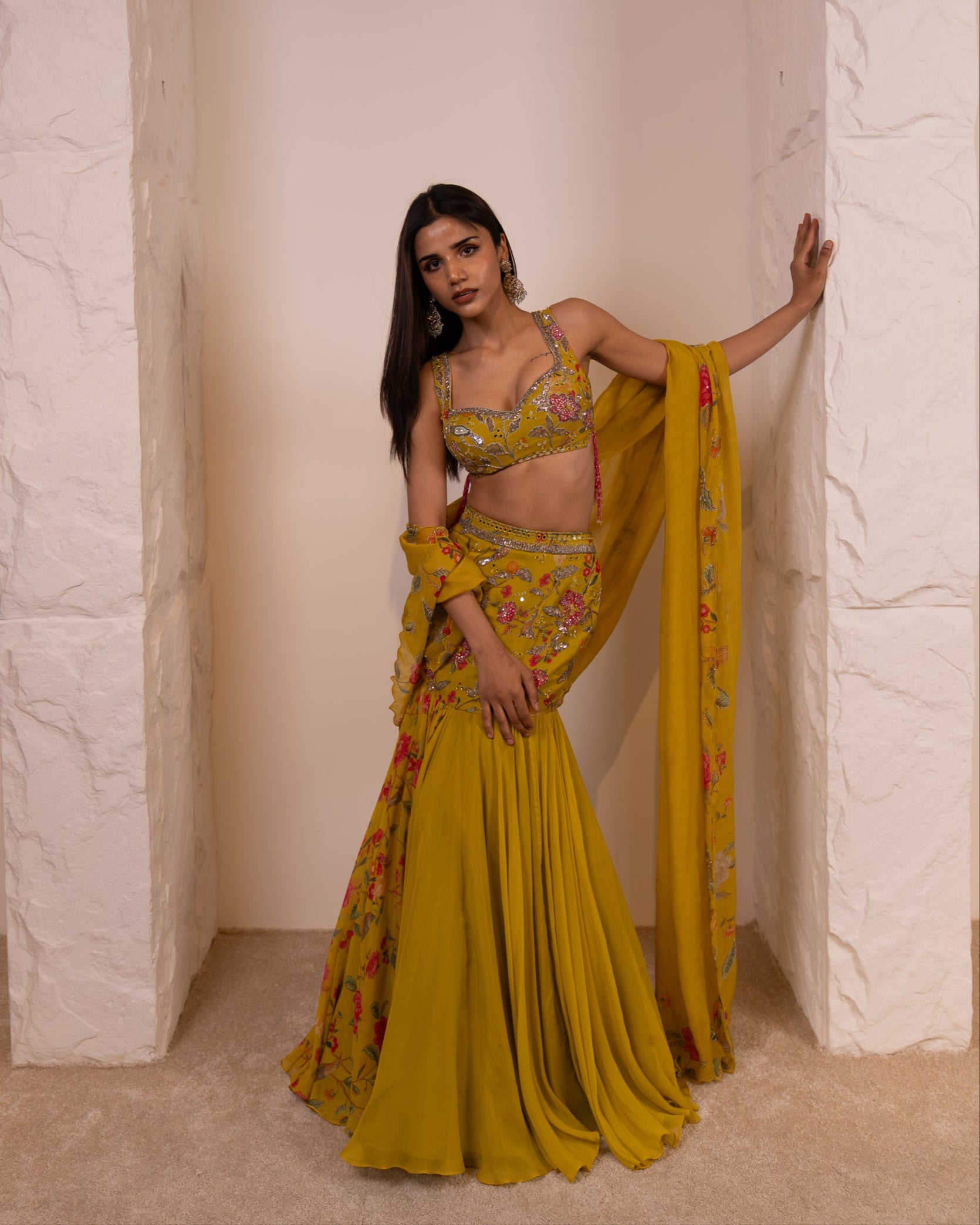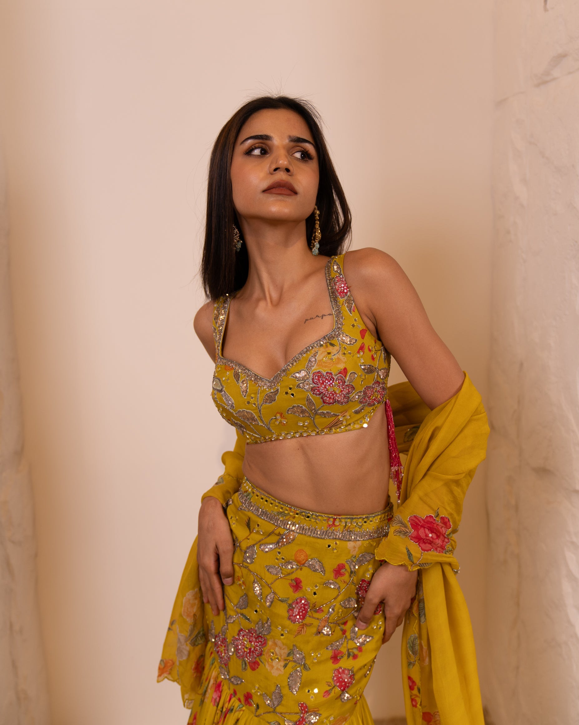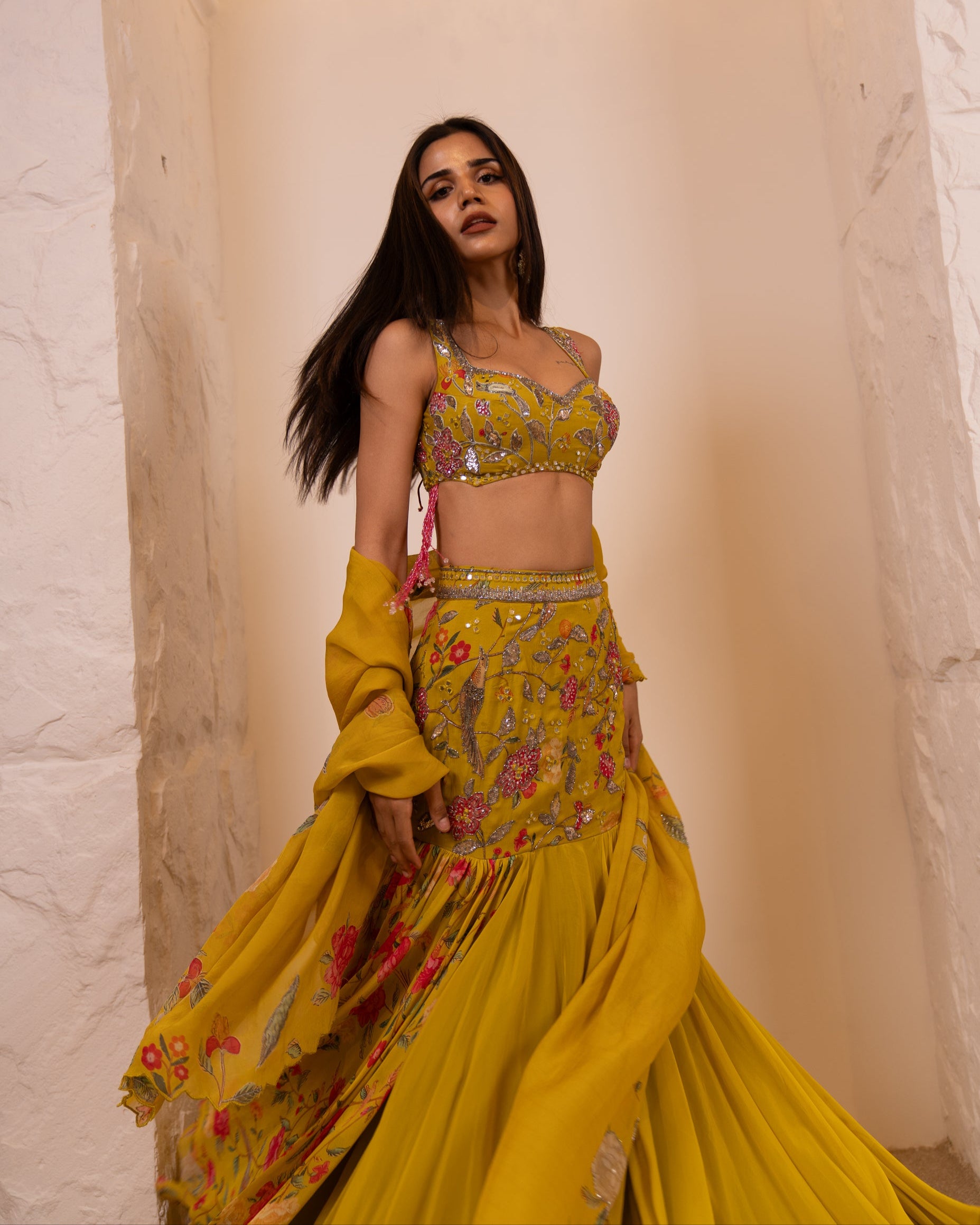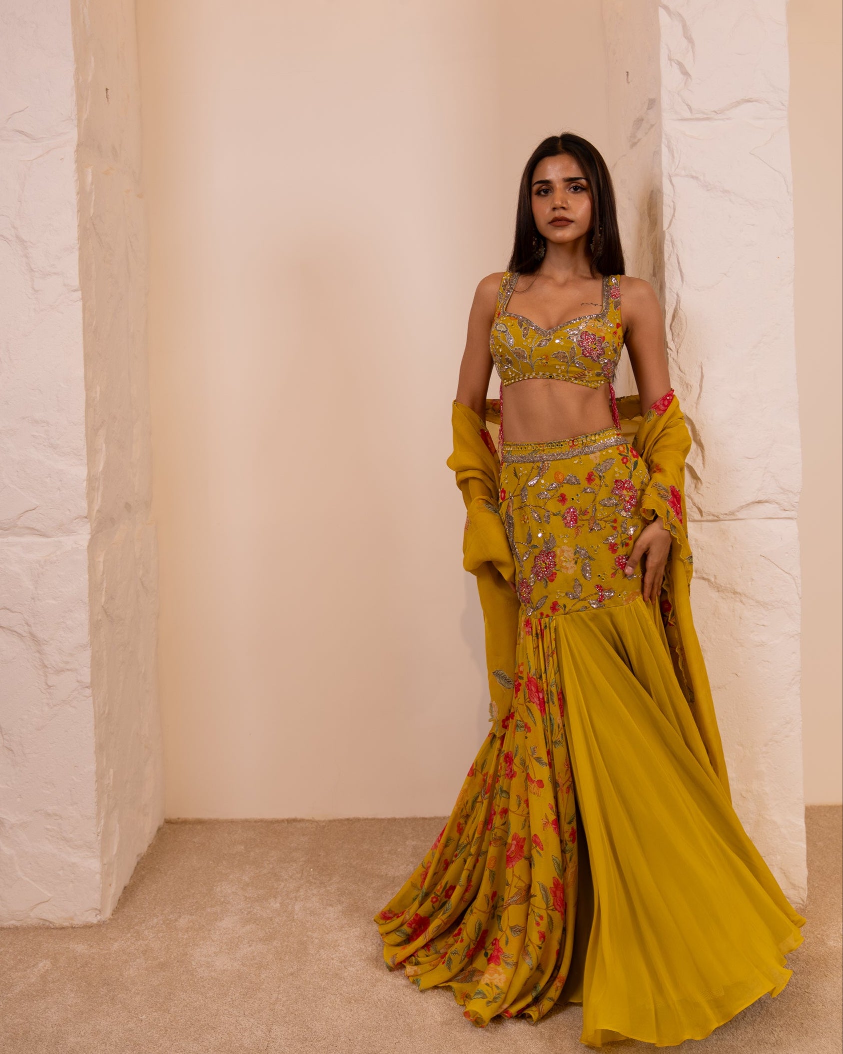 A floral fish cut skirt lehenga paired with a mirror-embroidered floral top with hangings is a stunning and intricate outfit often worn at festive or ceremonial occasions.