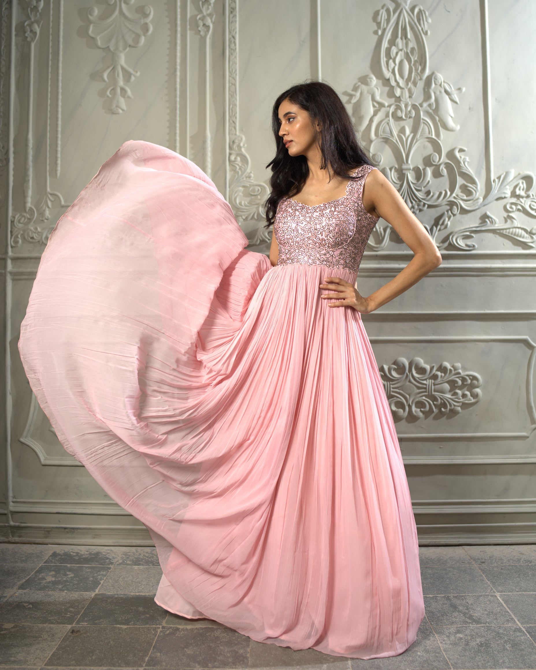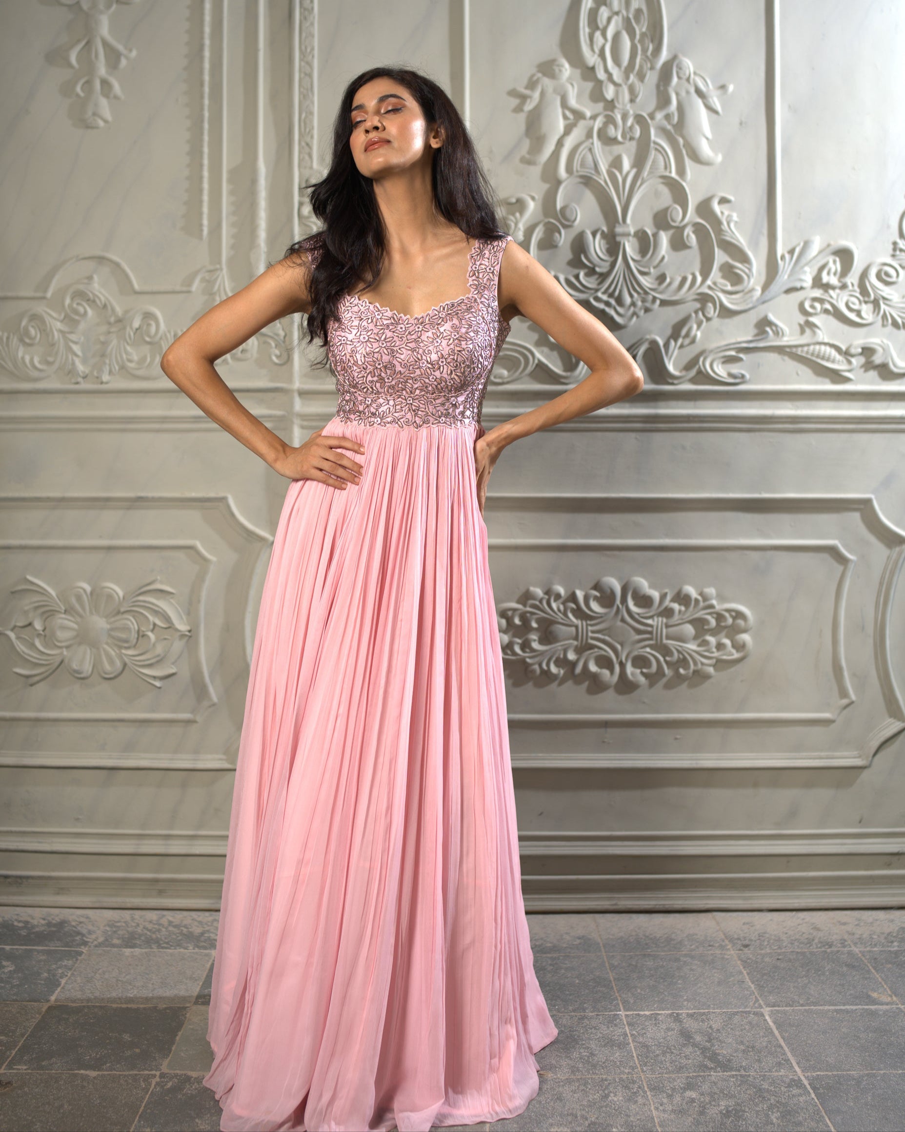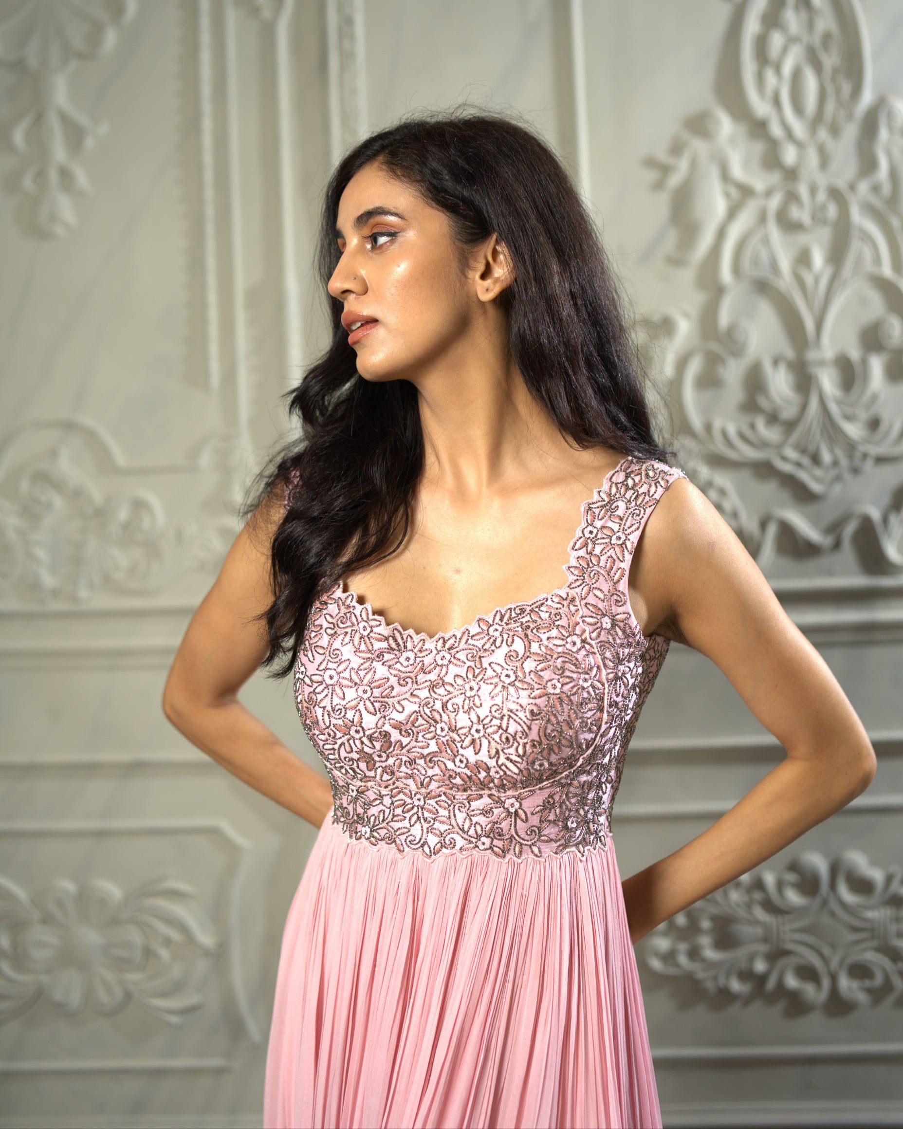 A graceful light pink gown with intricate floral embroidery on the bodice, flowing into a dreamy silhouette. Elegant, feminine, and effortlessly timeless.