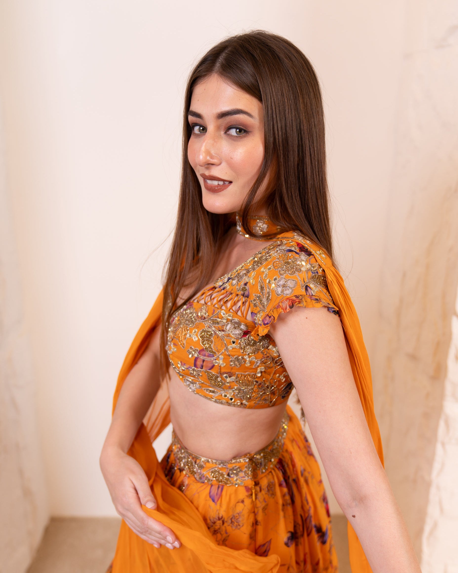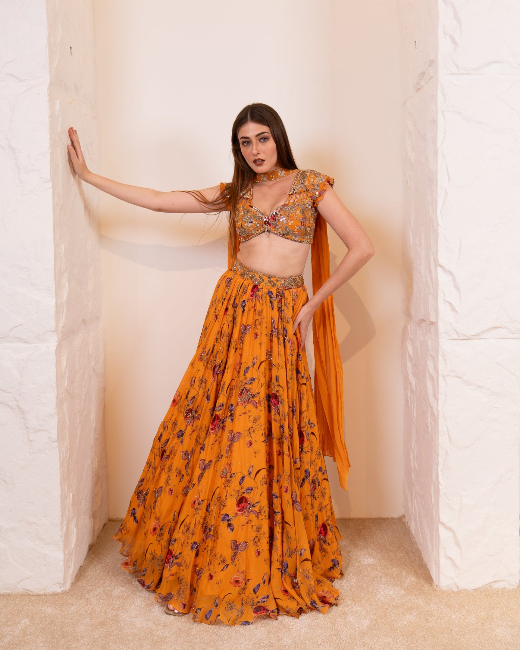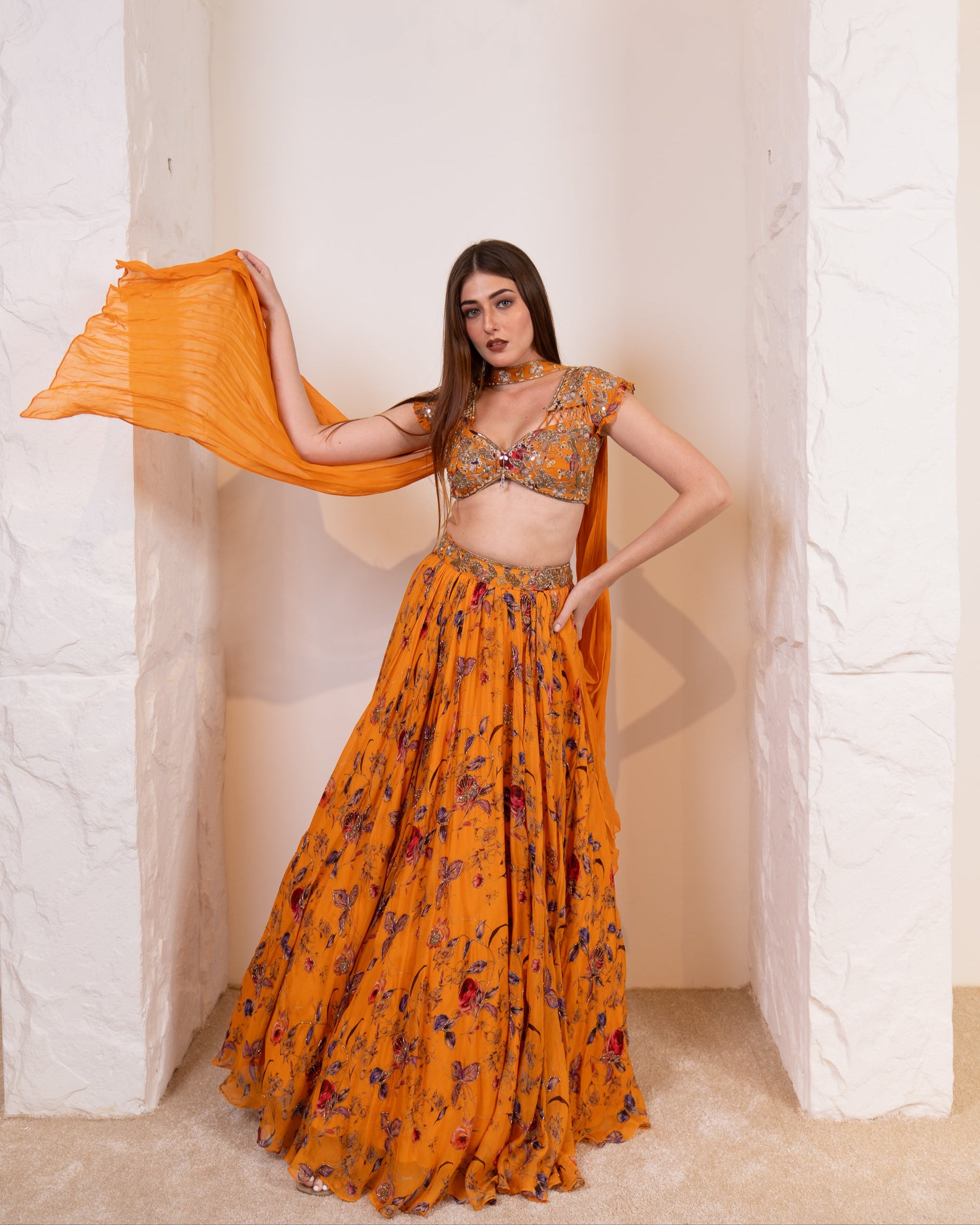 Orange lehenga, its vibrant hue shimmering with mirror work that dances like flickering fireflies. The choker, a delicate band of light, adorns the neck with a celestial glow. Draped in a sheer organza dupatta, this ensemble flows like liquid gold, casting a dreamlike, ethereal aura with every movement.
