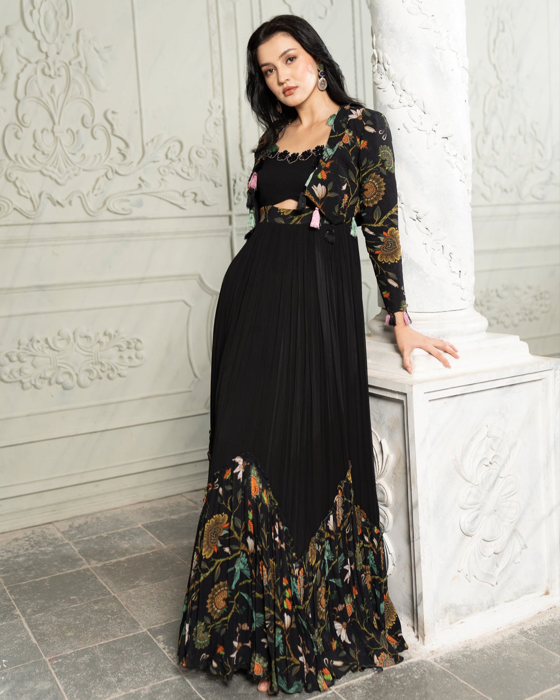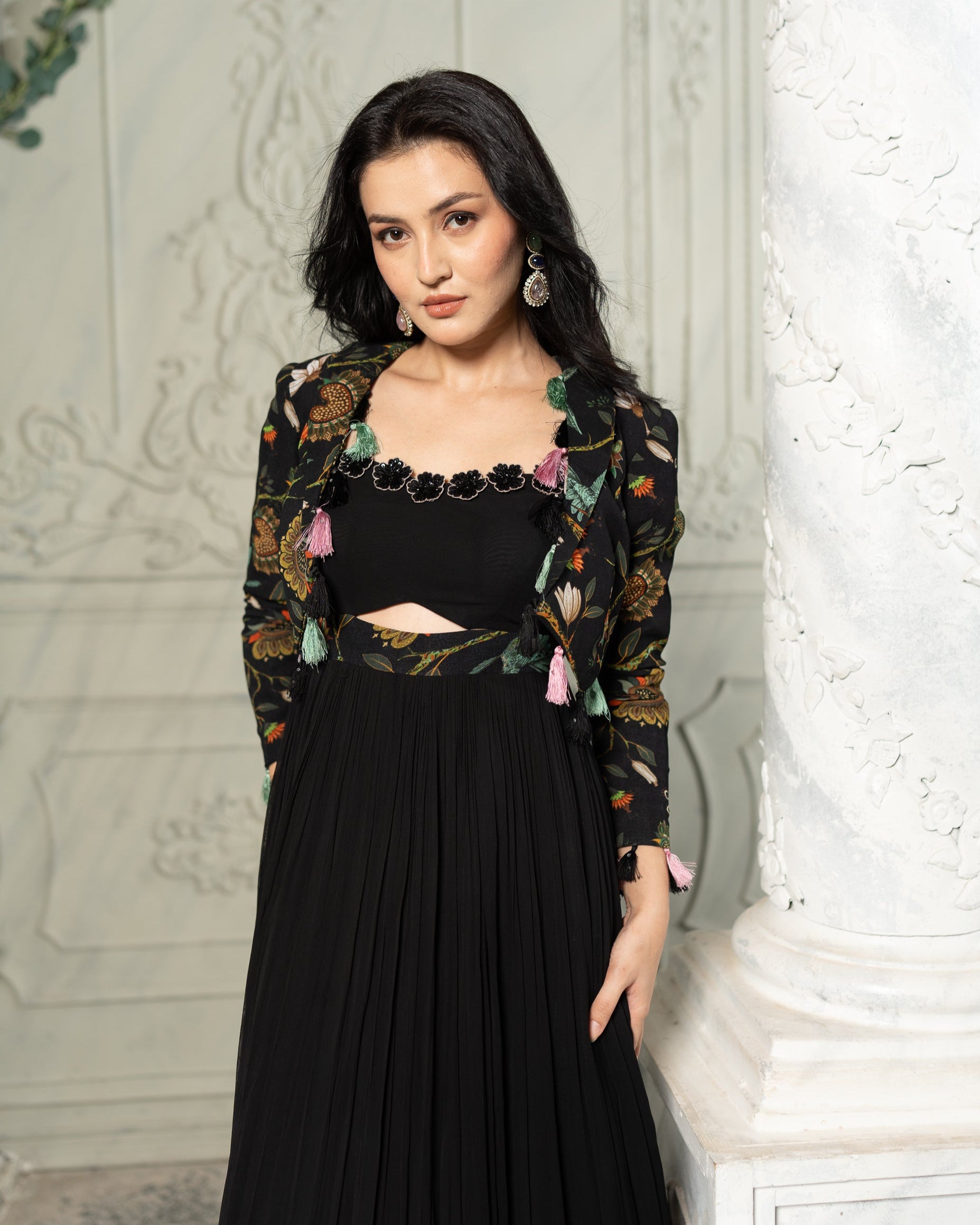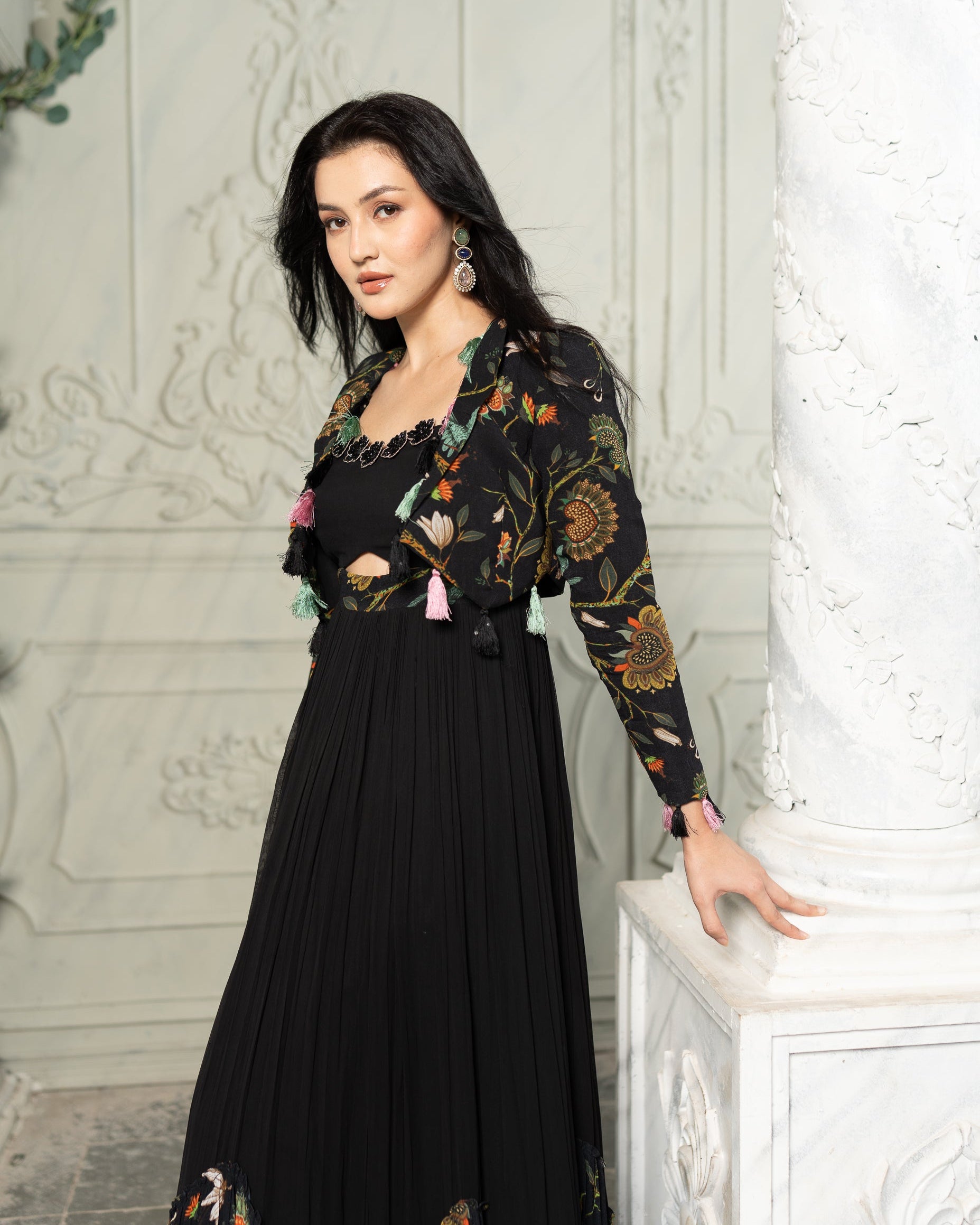 Stylish black cropped blazer with colorful hangings, paired with a spaghetti dress featuring 3D floral embellishments on the neckline.