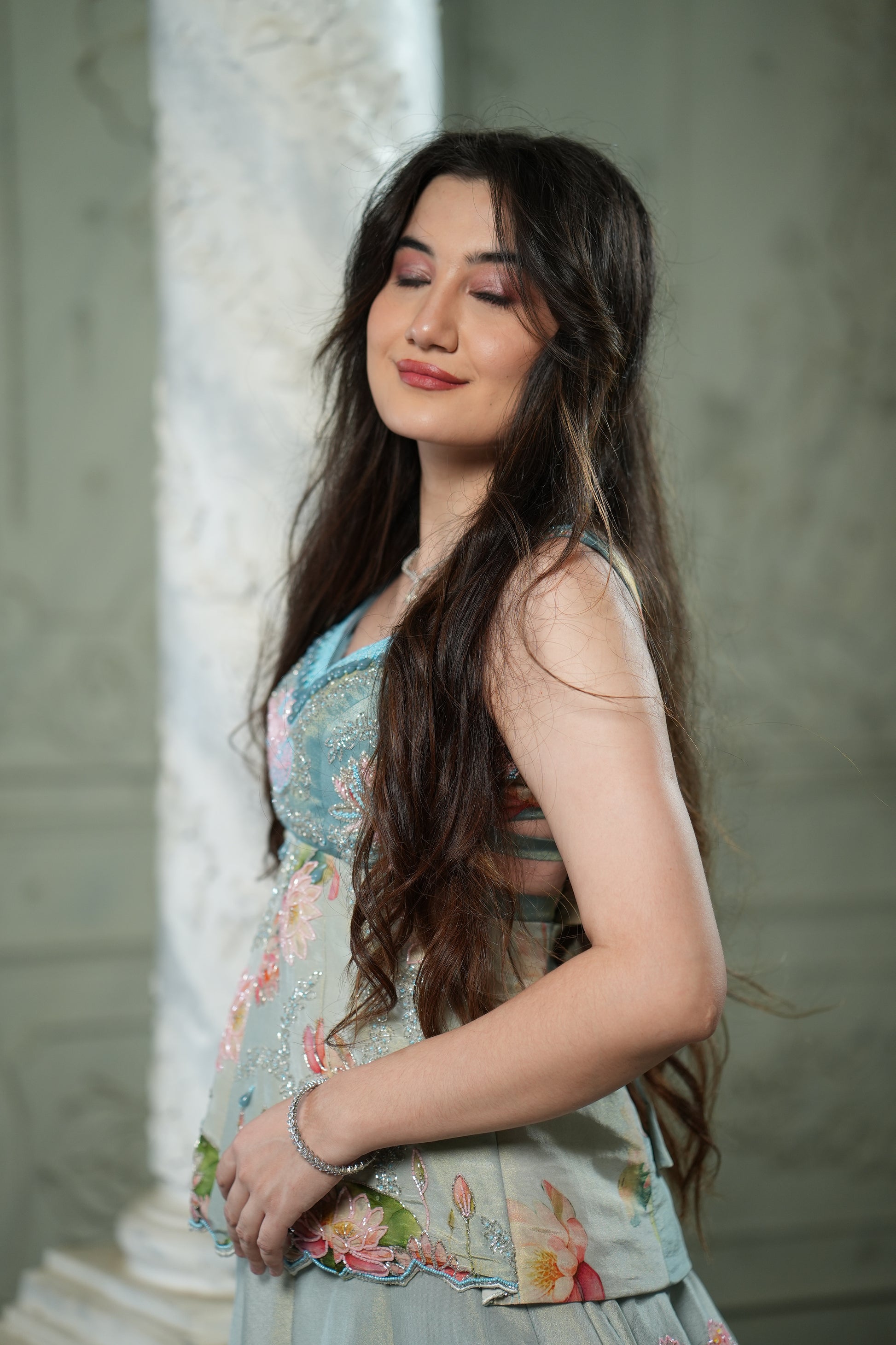 A dreamy pastel lehenga set with delicate floral embroidery and a soft, flowy skirt. Lightweight, feminine, and perfect for festive occasions. Pair with minimal jewellery for an elegant, picture-perfect look.