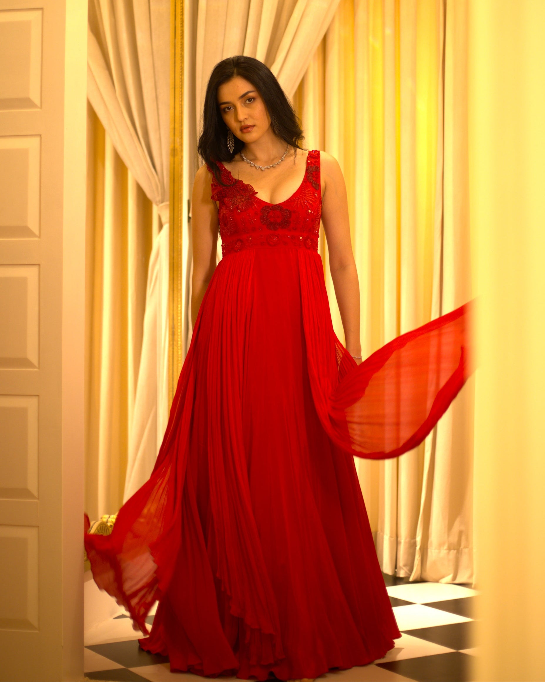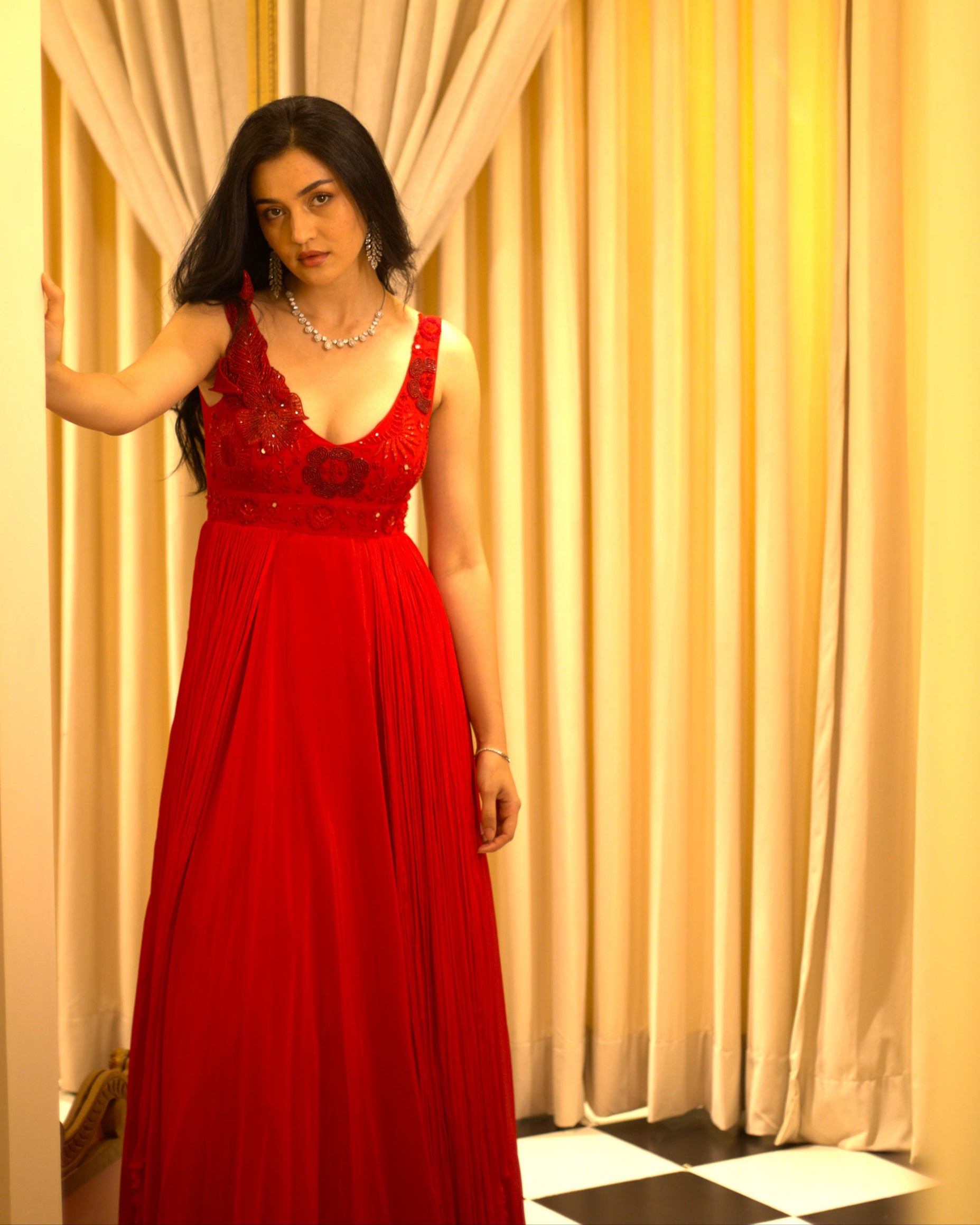 She’s a Venetian red floor length gown with layers of georgette and crepe with 3D work on the body, perfect for a cocktail.